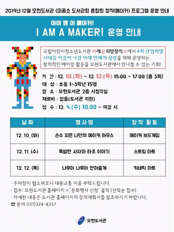 모현도서관은 책 속 이야기로 다양한 창작물을 만드는 프로그램에 참여할 초등 1~3학년생 15명을 4일부터 모집한다. 어린이들이 책을 읽는데서 그치지 않고 창의적인 활동을 하면서 상상력을 기르도록 도우려는 것이다. 참여자들은 10~12일 모현도서관에서 책을 통해 스스로 문제를 찾아 그 해결방법을 고민하고 서로 공유하면서 다양한 창작물을 만들게 된다. 창작 활동으로 다양한 도구로 원하는 창작물을 직접 설계해 만드…