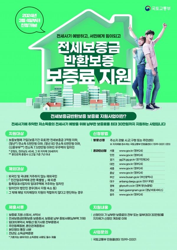 용인특례시(시장 이상일)는 저소득 임차인의 주거 안정을 돕기 위해 전세보증금 반환보증료를 최대 30만원까지 지원한다고 5일 밝혔다. 전세보증금 반환보증이란 임차인이 전세 계약 종료 시 임대인으로부터 보증금을 안전하게 돌려받을 수 있도록 주택도시보증공사(HUG), 한국주택금융공사(HF), 서울보증보험(SGI) 등이 책임지는 보증상품으로, 전세 사기 피해를 예방하기 위한 국가사업이다. 청년을 대상으로 전세보증금 반환보…