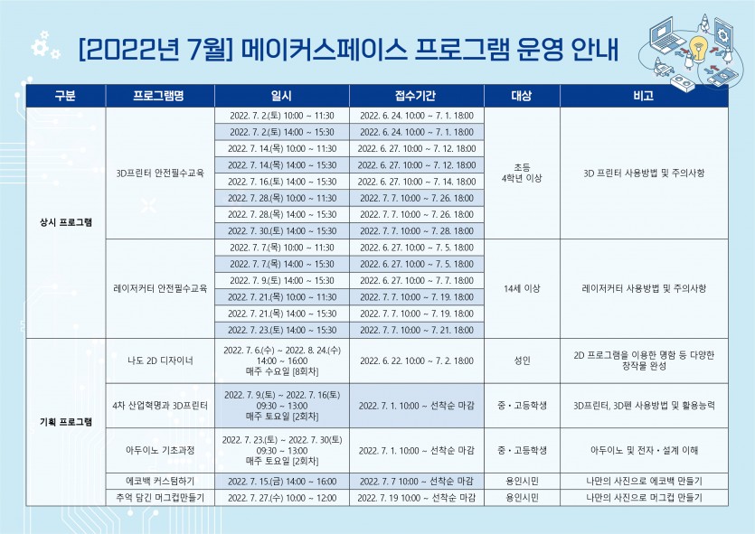 메이커 스페이스에서 나만의 디지털 창작물 만드세요 - 수지도서관, 3D프린터 사용법 등 7월 교육프로그램 7강좌 120명 모집 김경순 기자 2022-06-30 07:33 가 본문내용 확대/축소 본문 메이커 스페이스에서 나만의 디지털 창작물 만드세요 용인시 수지도서관이 메이커 스페이스 7월 교육 프로그램 참여 교육생 120명을 선착순 모집한다. 메이커 스페이스는 3D프린터 등 디지털 기술 기반 제조기기를 개방·공유해 이용자들이 창업과 교육을 위한 창작활동을 하도록 돕는 공간이다. 지난 4월 재개관한 수지도서관은 전국 공공도서관 최초로 디지털창작소를 마련, 이 안에 메이커스페이스와 함께 VR‧AR체험관, 미디어창작실을 운영하고 있다. 7월 교육에선 3D프린터 안전필수교육(7월 2일~7월 30일)과 레이저커터 안전필수교육(7월 7일~7월 23일) 등 상시프로그램을 진행한다. 또 2D프로그램으로 명함 등을 만드는 ‘나도 2D 디자이너’(7월 6일~8월 24일), 3D프린터와 3D펜 사용법을 알아보는 ‘4차 산업혁명과 3D프린터’(7월 9일~7월 16일), 아두이노 및 전자 설계 이해에 대한 ‘아두이노 기초과정’(7월 23일~7월 30일) 등 기획 프로그램도 준비했다. 사진을 담은 나만의 에코백이나 머그컵을 만드는 강좌도 각각 15일과 27일 진행된다. 초등 4학년 이상 용인시민이라면 누구나 참여 가능하며, 수지도서관 홈페이지(https://lib.yongin.go.kr/suji/)에서 신청 가능하다. 프로그램별 교육 일정과 대상, 재료비 등 세부 내용은 전화(031-324-8977/8975)로 문의하면 자세히 안내받을 수 있다. 도서관 관계자는 “4차 산업 혁명의 핵심 기술을 익혀 자신의 상상력과 아이디어를 구현하고자 하는 시민들이 이번 교육을 통해 진로‧취업에 도움이 되는 다양한 경험을 하기 바란다”고 말했다. 한편 지난 4월 수지도서관 개소 이후 1397명의 시민이 가상현실 체험 및 디지털 창작활동을 목적으로 디지털창작소를 다녀갔다. 수지도서관 일평균 이용자 수는 3209명이다. 좋아요 0 싫어요 0 김경순 기자 기자의 다른기사 보기 목록 댓글목록 이전글 축산 악취 저감 종합대책 시행 효과‘톡톡’…민원 대폭 감소 22.06.30 다음글 용인시, 대장금파크 기념품샵에서 지역 농특산물 전시·판매 22.06.30