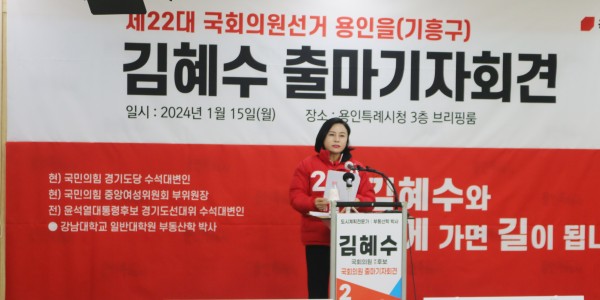 안녕하세요. 제22대 국회의원선거 용인시을 국민의힘 예비후보 김혜수입니다. 금일 10시30분 용인특례시청 3층 브리핑룸에서 진행한 출마기자회견을 했다. 오늘 김혜수 예비후보는 도시계획전문가로서 현 용인의 문제점을 가장 잘 진단할 수 있는 후보임을 역설했고, 용인을 예비후보 등록자들에게 TV토론을 통한 검증과정을 함께 받자고 제안했습니다. 부동산 전문가 용인의 발전에 앞장 설수있는 후보임을 강조했다. …