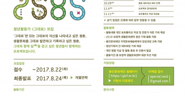 (재)용인문화재단(이사장 정찬민) 보정역 생활문화센터에서는 용인의 청년 생활문화 활성화를 위해 8월부터 11월까지 진행되는 ‘청춘대로 2585’에서 활동할 청년활동가 ‘그대로’를 8월 22일까지 모집한다. ‘청춘대로 2585’는 문화체육관광부와 (재)생활문화진흥원이 함께 추진 중인…