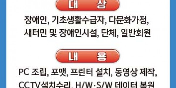 한국장애인문화협회 용인지부(전욱재회장)에서 무료로 컴퓨터 고쳐주기 행사를 하고 있습니다. 필요하신 장애우께서는 연락 주거나 현장(용인실내체육관)으로 나오시면 현장에서 고처주거나 마껴면 가능합니다.
