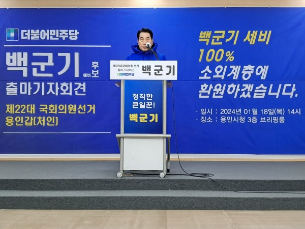 백군기 전 용인특례시장은 18일 용인시 처인구의 새로운 미래를 준비하기 위해 제 22대 국회의원 선거에 출마하겠다고 선언했다, 백 전시장은 이날 용인시청 브리핑 룸에서 기자회견을 열고, “처인구 주민이 뽑아준 역대 국회의원들 모두 안타깝게도 주민의 염원을 져버렸다”며, 처인구의 발전을 위해 다시 한번 기회를 달라고 말했다, 백군기 후보는 시장 재임시절 120조원 규모의 SK하이닉스 반도체 클러스터 유치, 실효위기…