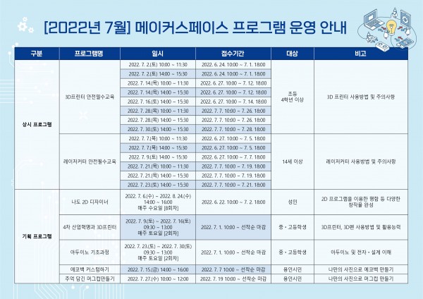 용인시 수지도서관이 메이커 스페이스 7월 교육 프로그램 참여 교육생 120명을 선착순 모집한다. 메이커 스페이스는 3D프린터 등 디지털 기술 기반 제조기기를 개방·공유해 이용자들이 창업과 교육을 위한 창작활동을 하도록 돕는 공간이다. 지난 4월 재개관한 수지도서관은 전국 공공도서관 최초로 디지털창작소를 마련, 이 안에 메이커스페이스와 함께 VR‧AR체험관, 미디어창작실을 운영하고 있다. 7월 교육에선 3D프린터 안전…