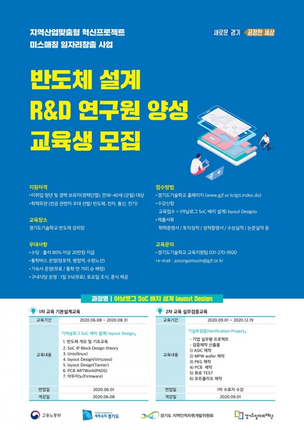 경기도일자리재단이 ‘반도체 설계 R&D 연구원 양성 과정’ 교육생 32명을 모집한다.이번 과정은 반도체 설계 전문가를 양성해 인력 수급에 어려움을 겪고 있는 도내 중소 반도체 기업에 양질의 인력을 제공하고자 개설됐다.반도체 분야에 관심이 있는 미취업 청년이라면 누구나 교육에 참여할 수 있다. 신청 기간은 6월 1일 오후 6시까지로, 경기도기술학교 홈페이지(gjf.or.kr/gti/index.do)를 통해 신청하면 된다.…