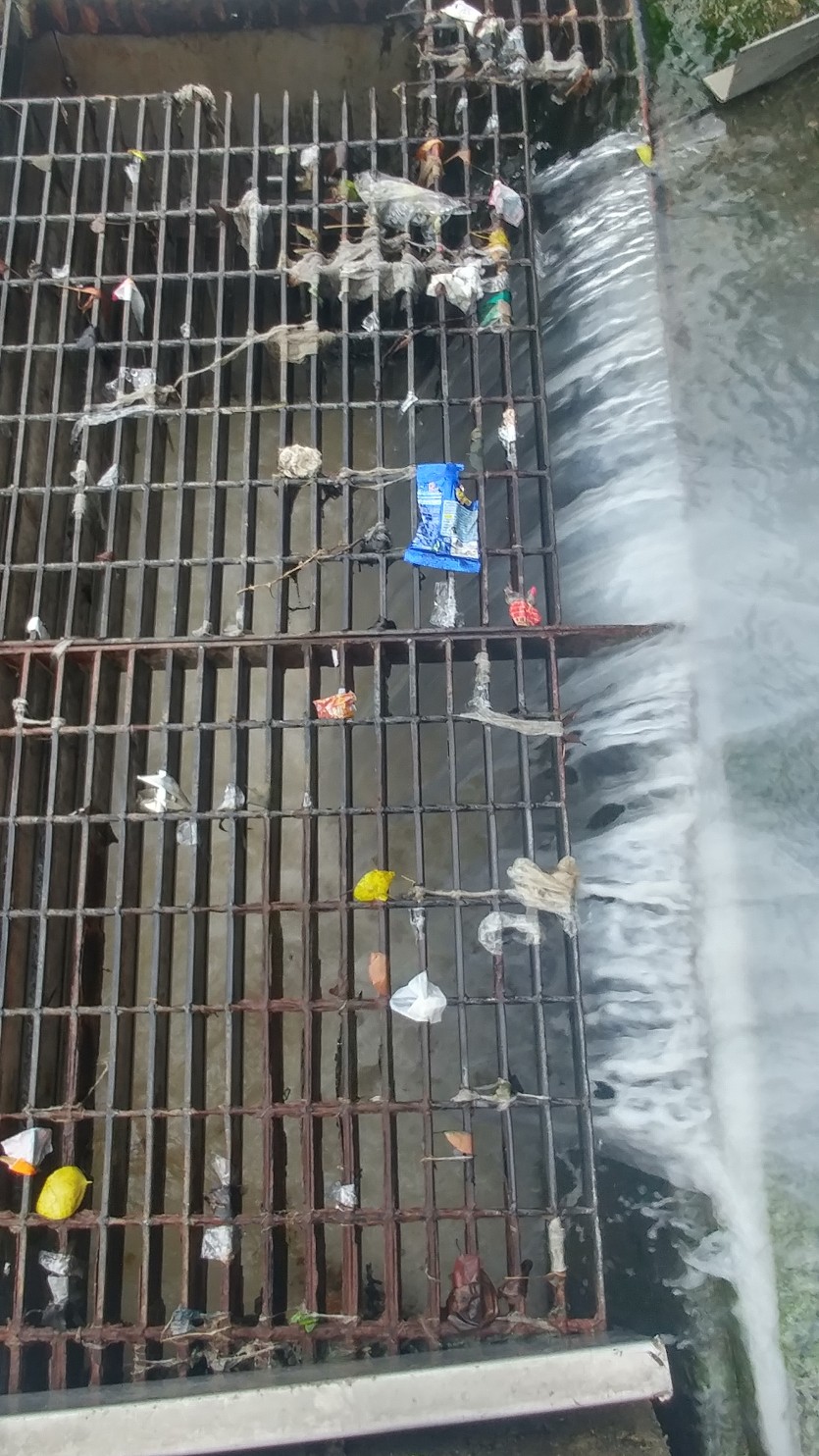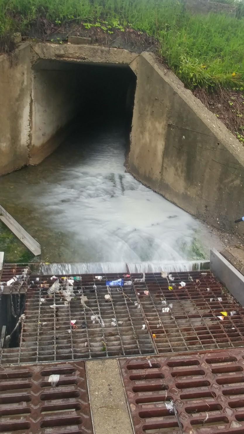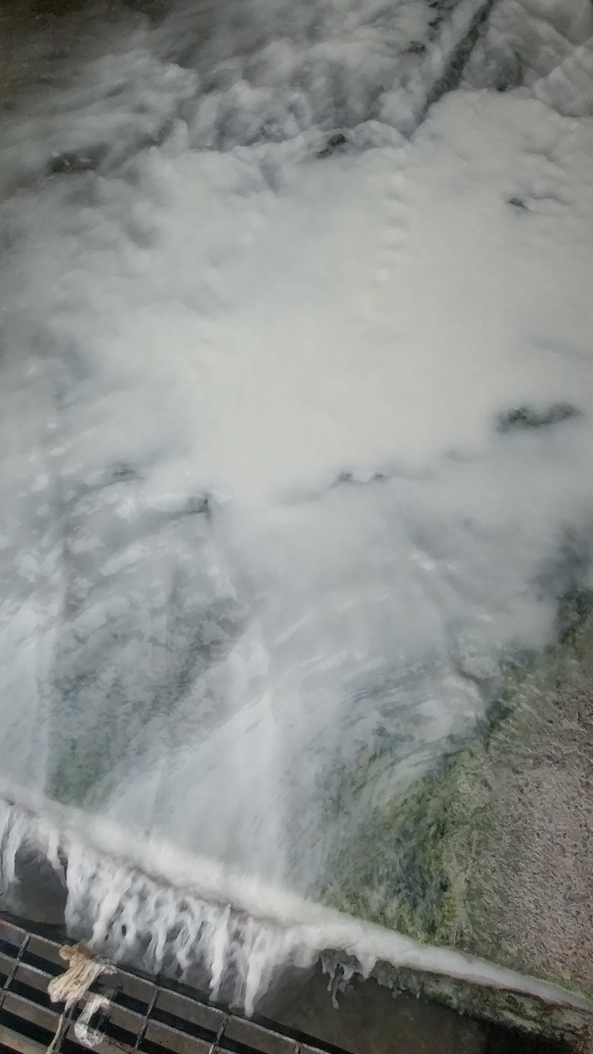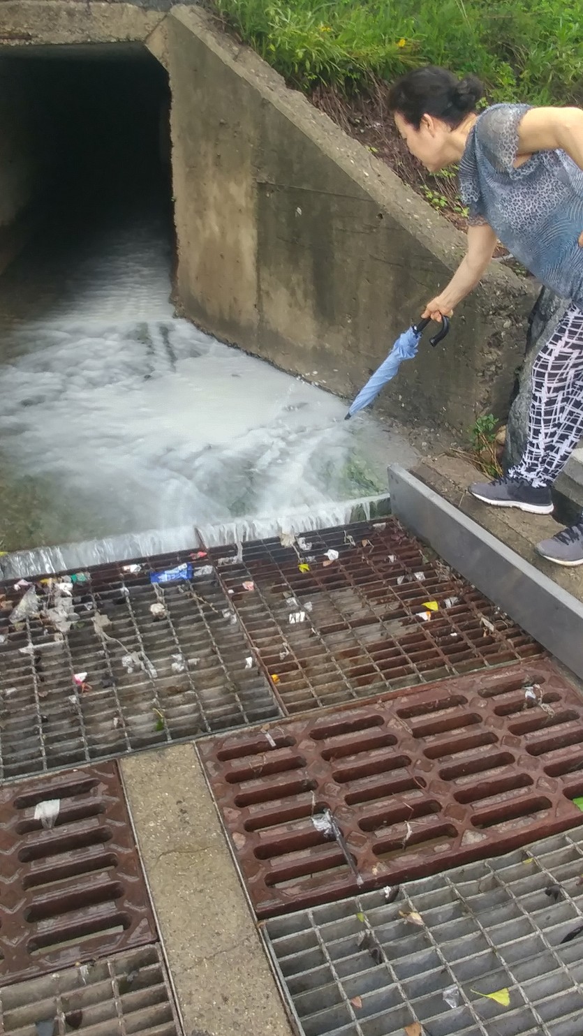 강남병원 앞 하수구에서 정체몰을 물질이 신갈천으로 흘러 나오고있다.