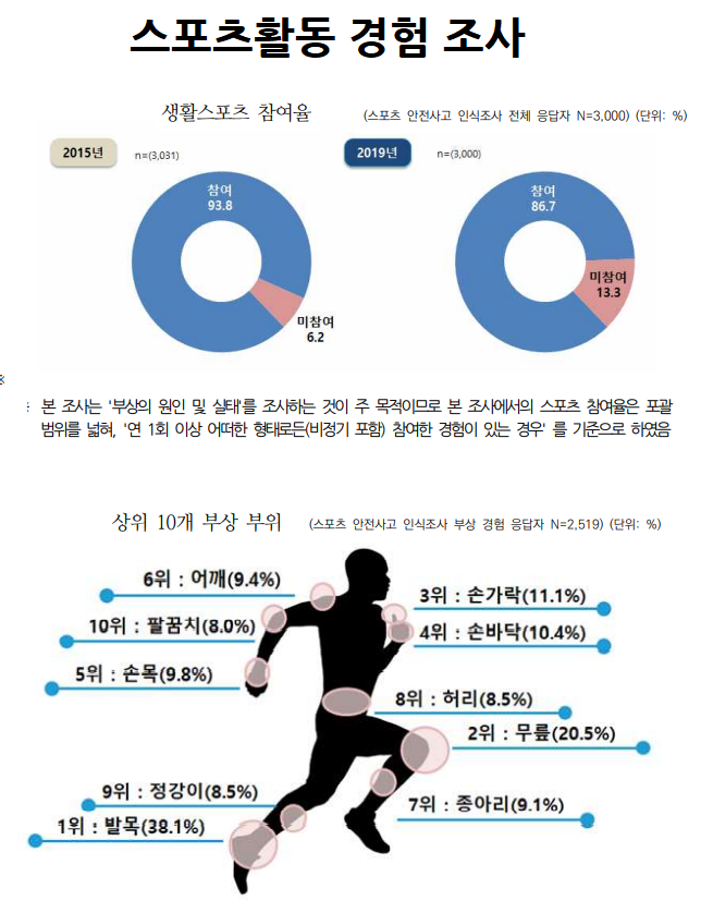 스포츠안전재단의 2019년도 스포츠안전사고 실태조사를 살펴보면, 64.3%가 스포츠 활동 중 부상 경험이 있다고 답했다. 생활스포츠 부상 부위 1위는 발목(38.1%), 2위 무릎(20.5%), 3위 손가락(11.1%) 순으로 나타났고 주1회 이상 생활스포츠 활동을 하는 국민이 2015년 대비 7.5% 감소한 것으로 나타나기도 했다. 코로나19 확산으로 인해 지난 2년간 생활스포츠 인구 감소는 더 커졌을 것으로 보인다.