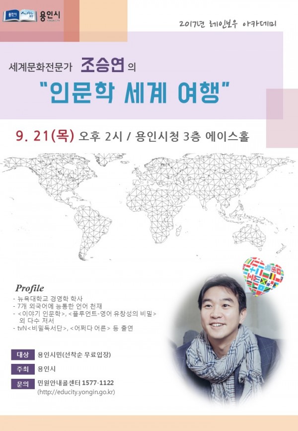 용인시는 오는 21일 시청에이스홀에서 세계문화전문가 조승연 작가를 초청해 다양한 분야의 명사의 강연을 듣는‘레인보우아카데미’의 특강을 개최한다고 밝혔다. 이날 조승연 작가는 ‘인문학 세계여행’을 주제로 고대 그리스와 로마의 차이점, 중세시대 산티아고 길의 유래, 프랑스 고딕문화, 이탈리아 문화 등에 대해 들려주며, 유럽의 근‧현대 문화의 의미를 강조할 예정이다. 7개 국어를 능통하게 구사하는 언어 천재로 알려진 조승연씨는 ‘언어천재 조승연의 이야기 인문학’ 등을 쓴 작가로 방송, 강연 등의 다양한 활동을 펼치고 있다. …