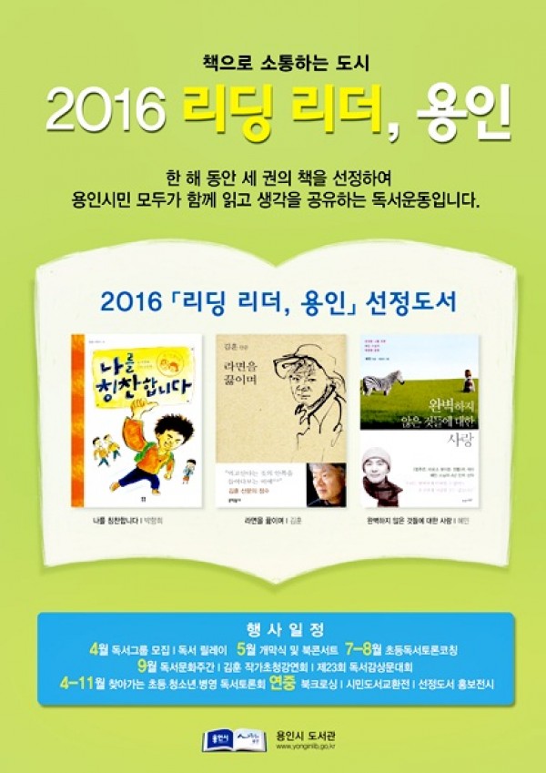 용인시민이 함께 읽을 독서캠페인 대상의 책으로 ‘나를 칭찬합니다(박향희 저)’, ‘라면을 끓이며(김훈 저)’, ‘완벽하지 않은 것들에 대한 사랑(혜민 저)’ 등 3권이 선정됐다. 용인시는 책으로 소통하는 도시를 만들기 위해 추진하는 독서운동 ‘리딩리더, 용인’의 최종도서로 이들 3권을 선정하고 오는 18일 독서캠페인을 시작하는 개막식을 열기로 했다고 밝혔다. 이들 도서는 시민과 도서관에서 추천한 119권…