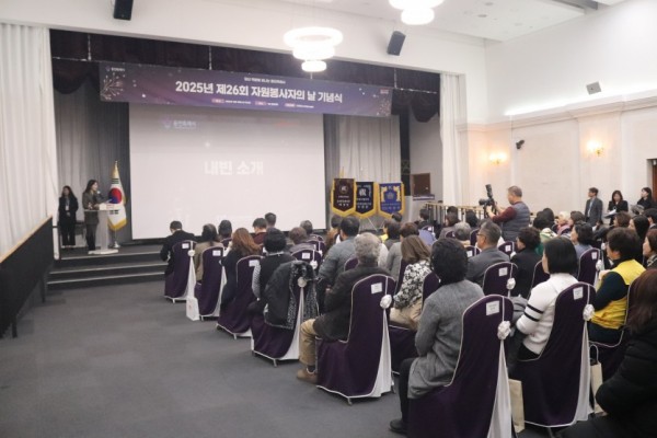 재단법인 용인시자원봉사센터는 지난 12월 10일 시청 컨벤션홀에서 ‘제26회 자원봉사자의 날 기념식’을 개최하고, 지역 곳곳에서 나눔과 실천을 이어온 자원봉사자들에게 감사의 마음을 담아 표창장을 수여했다. 이번 기념식에는 류광열 용인특례시 제1부시장, 이윤미 용인시의회 운영위원장을 비롯한 시의원, 권오성 용인시자원봉사센터장 등 관계자와 수상자 90여 명이 참석해 자리를 함께했다. 이날 행사에서는 국무총리상, 경기도지사상, 용인특례시장상, 용인시의회 의장상, 국회의원상, 자원봉사센…