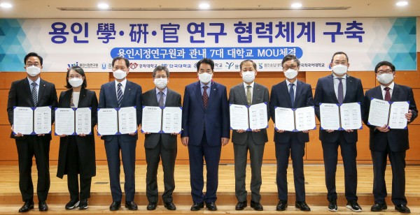 용인시정연구원은 21일 시청 비전홀에서 과제 대응능력을 향상하기 위해 관내 7개 대학과 공동연구 업무 협약을 맺었다고 밝혔다. 이날 협약식에는 용인시정연구원 이사장인 백군기 용인시장을 비롯해 전준경 용인시정연구원장, 전병찬 강남대 부총장, 한균태 경희대 총장, 김수복 단국대 총장, 유병진 명지대 총장, 박선경 용인대 총장, 최성식 용인송담대 총장, 김인철 한국외국어대학 총장 등 관계자 10여명이 참석했다. 이번 협약에 따라 시정연구원은 7개 대학과 포괄적인 연구역량을 모으는 데 공유‧협력하고 각 대학은 시민 삶의 질을 높…