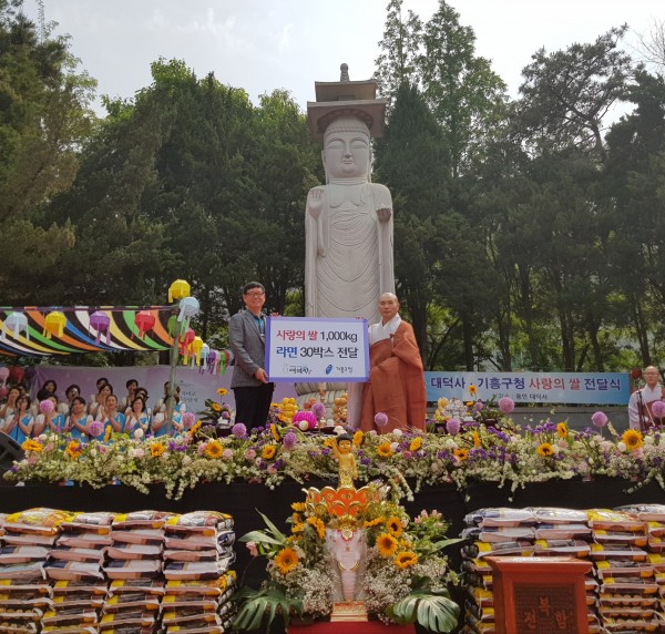 용인시 기흥구는 12일 부처님 오신 날을 맞아 대한불교조계종 대덕사가 저소득층을 위해 쌀 10kg 100포와 라면 30상자를 기탁했다고 밝혔다. 이는 지난 2017년 기흥구와 대덕사가 지역의 저소득층 이웃에 사랑을 나누기 위해 ‘사랑의 쌀’ 후원 협약을 맺은 데 따른 것이다. 이번에 기탁한 물품은 관내 저소득층 및 취약계층에 전달할 예정이다. 이동무 기흥구청장은 “이웃을 위해 나눔을 실천한 대덕사에 감사한다”며 “도움이 필요한 분들에게 기탁한 쌀과 라면을 잘 전달할 것”이라고 말했다. 대덕사는 그간 관내 저…