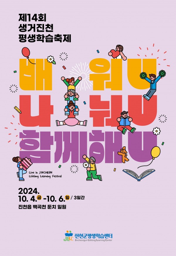 진천군, 제14회 생거진천 평생학습 축제 개최 진천군은 오는 10월 4일부터 3일간 진천읍 백곡천 둔치 일원에서 제14회 생거진천 평생학습 축제를 개최한다고 24일 밝혔다. 올해 생거진천 평생학습 축제의 주제는 ‘배워 U, 나눠 U, 함께해 U’이며, 평생학습을 통한 배움의 즐거움을 군민과 나누고 성과를 군민과 함께해 즐거움을 전 세대에 알린다는 의미를 담고 있다. 또한, 어린이부터 어르신까지 전 연령대가 함께 즐길 수 있는 학습 축제의 장으로 만들기 위해 온 가족이 함께 …