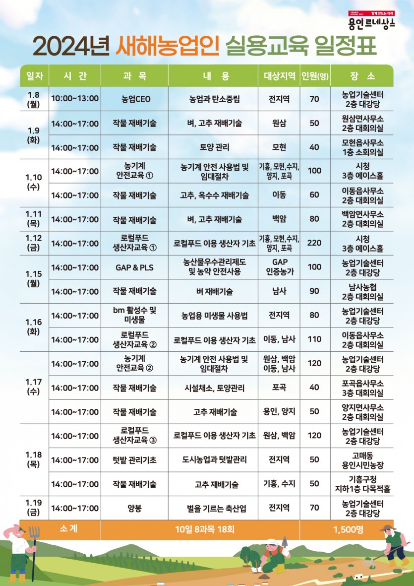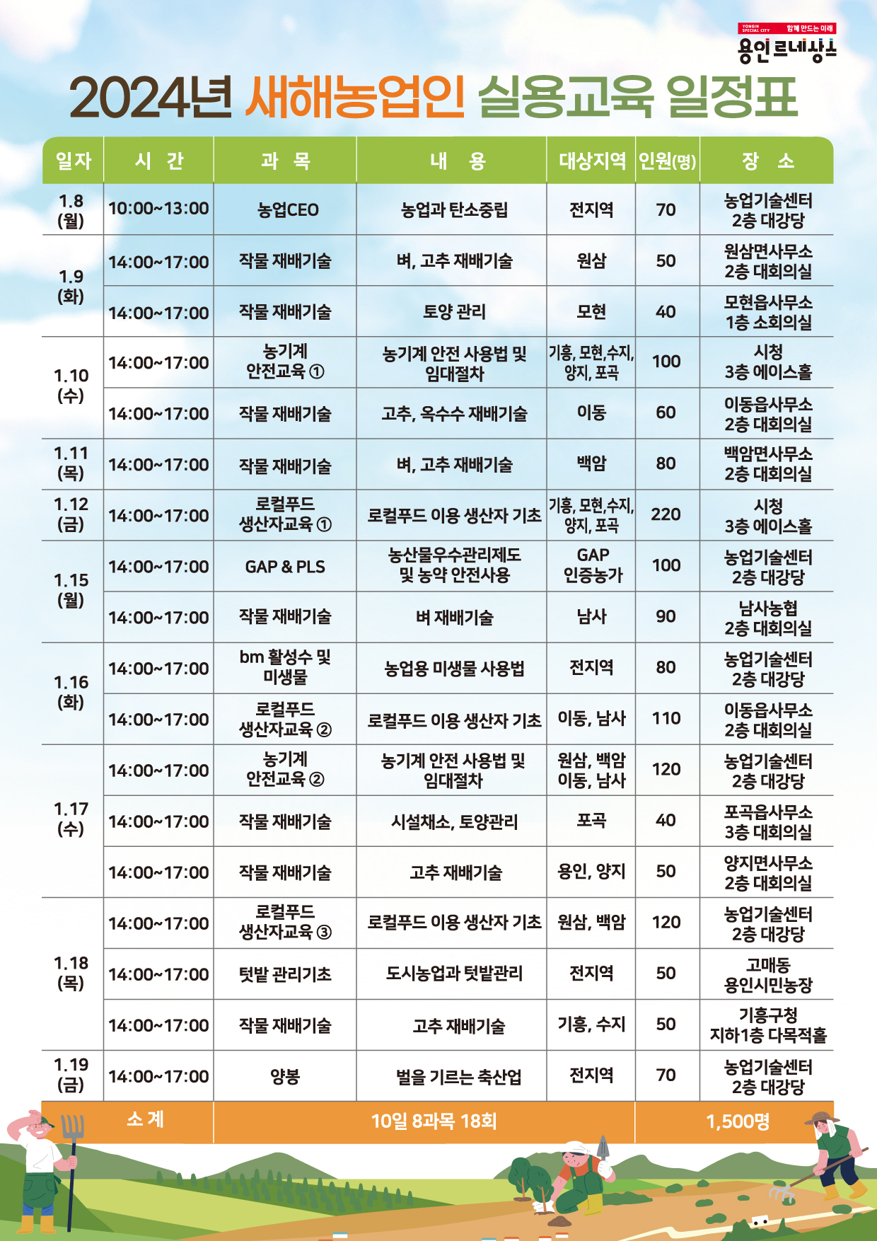 용인특례시, 8일부터 새해농업인실용교육 시작 - 새해 영농계획 수립 위해…농업인 1500명 대상 8개 과목 18개 강좌 운영 김경순 기자 2024-01-05 08:07 가 본문내용 확대/축소 본문 용인특례시, 8일부터 새해농업인실용교육 시작 용인특례시(시장 이상일)가 새해 영농계획을 수립하려는 농업인 1500명을 대상으로 8일부터 19일까지 새해농업인실용교육을 진행한다. 시는 새롭게 달라지는 농업정책과 품목별 최신 영농기술에 대한 정보를 공유해 농업인의 경쟁력을 강화하도록 돕기 위해 매년 교육을 진행하고 있다. 올해 교육은 8일 ‘농업과 탄소중립’을 시작으로 작물 재배기술, 농기계 안전교육, 로컬푸드 생산자 교육, 텃밭관리, 양봉 등 8개 과목 18개 강좌로 구성됐다. 수강을 원하는 농업인은 처인구 원삼면 농업기술센터를 비롯해 원삼면, 이동읍, 모현읍 행정복지센터 등 각 강좌별 일정과 장소를 확인해 당일 현장에 참석하면 된다. 자세한 내용은 용인시농업기술센터 홈페이지(https://www.yongin.go.kr/atc/index.do)를 통해 확인할 수 있으며 문의 사항은 자원육성과 인력육성팀(031-324-4048)으로 문의하면 된다. 좋아요 0 싫어요 0 김경순 기자 기자의 다른기사 보기 목록 댓글목록 이전글 용인특례시 ‘사랑의 열차 이어달리기’에 지역 기업 ‘GA코리아’탑승 24.01.05 다음글 용인특례시, 가로등·신호등 전기안전 원격으로 점검 24.01.05