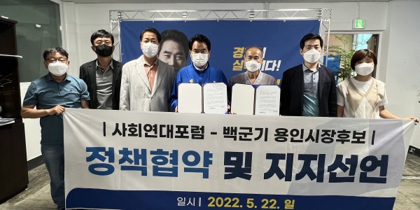 대한민국 국민행복포럼(회장 박종선)은 오늘(22일) 기흥구 신갈오거리 더불어민주당 백군기 후보 선거사무소에서 백군기 후보 지지를 선언했다.국민행복포럼은 “백군기 후보가 용인시장 최초로 한국매니페스토실천본부가 주관한 2022 민선7기 전국 기초단체장 공약 이행 및 정보공개평가에서 2년 연…