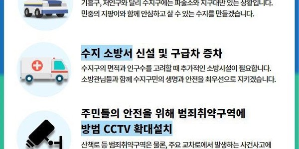 - '함께 사는 수지'를 만들기 위한 용인병 예비후보자인 정춘숙 국회의원의 행복공약 제6탄 : 더 안전한 수지를 만들겠습니다! - 정춘숙 예비후보자, "1. 용인 수지 경찰서 및 용인 수지 소방서 신설과 함께 범죄취약구역에 방범 CCTV확대설치"를 추진하여 '보다 더 안…