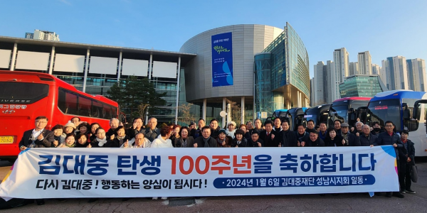 김대중 대통령의 탄생 100주년을 기념하는 행사가 6일 오후 2시부터 고양 킨텍스 제1전시관 5홀에서 열렸다. 성남에서는 이날 행사를 위해 버스 3대를 포함 자원봉사자 등 200여 명이 함께 김대중 대통령 100주년 기념식에 힘을 보태면서 '김대중의 정치적 고향 성남'이라는 이미지…