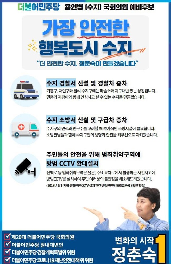 - '함께 사는 수지'를 만들기 위한 용인병 예비후보자인 정춘숙 국회의원의 행복공약 제6탄 : 더 안전한 수지를 만들겠습니다! - 정춘숙 예비후보자, "1. 용인 수지 경찰서 및 용인 수지 소방서 신설과 함께 범죄취약구역에 방범 CCTV확대설치"를 추진하여 '보다 더 안전한 수지'를 만들겠습니다!