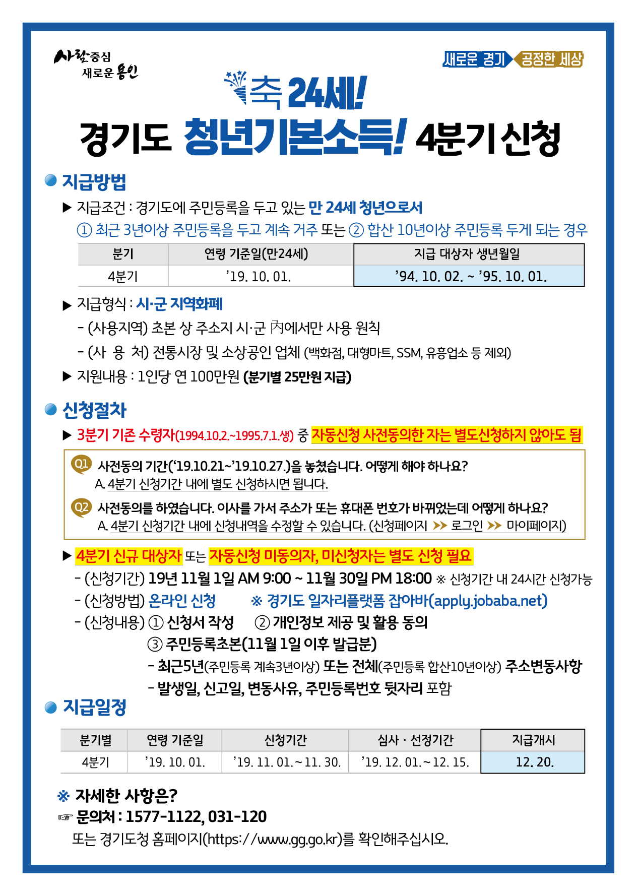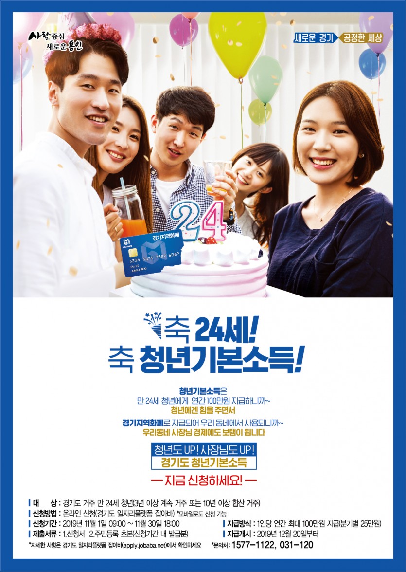 용인시, 2019년 4분기 청년기본소득 신청 접수 김경순 기자 2019-11-01 21:42 가 본문내용 확대/축소 본문 용인시, 2019년 4분기 청년기본소득 신청 접수용인시, 2019년 4분기 청년기본소득 신청 접수 용인시는 11월1일부터 30일 오후6시까지 4분기 청년기본소득 지급 신청을 받는다. 대상은 경기도에 3년 이상 계속 거주하거나 거주한 일수의 합이 10년 이상인 1994년 10월2일부터 1995년 10월1일 사이에 출생한 만24세의 용인시 청년이다. 신청은 경기도 일자리플랫폼 잡아바(apply.jobaba.net)에서 회원가입을 한 뒤 온라인 또는 모바일로 하면 된다. 시는 대상자 확인 뒤 오는 12월20일부터 25만원을 지역화폐인 용인와이페이로 지급할 예정이다. 올해 지원대상이지만 시기를 놓친 청년들도 4분기에 신청해야 지원금을 소급받을 수 있다. 시는 이번 4분기부터 자동신청에 동의한 청년은 매 분기마다 신청하지 않아도 혜택을 받을 수 있도록 했다. 다만 신규 대상자와 자동신청 미동의자는 접수기간 내에 반드시 신청을 해야 한다. 확정된 지급대상자엔 휴대폰 문자로 확정메시지를 보내며, 신청 시 입력한 주소로 공카드를 배송한다. 수령한 카드를 고객센터나 모바일 앱으로 등록하면 바로 체크카드처럼 사용할 수 있다. 지급받은 지역화폐는 용인시내 전통시장 및 소상공인 업체 등에서 현금처럼 자유롭게 사용할 수 있다. 백화점, 대형마트, 기업형 슈퍼마켓(SSM), 유흥업소 등에선 사용할 수 없다. 좋아요 0 싫어요 0 김경순 기자 기자의 다른기사 보기 목록 댓글목록 이전글 영덕동, 영덕동마을쟁이서 홀로어르신에 의료품 전달 19.11.01 다음글 수지 상업지역 내부도로 보행환경 대폭 개선 19.11.01