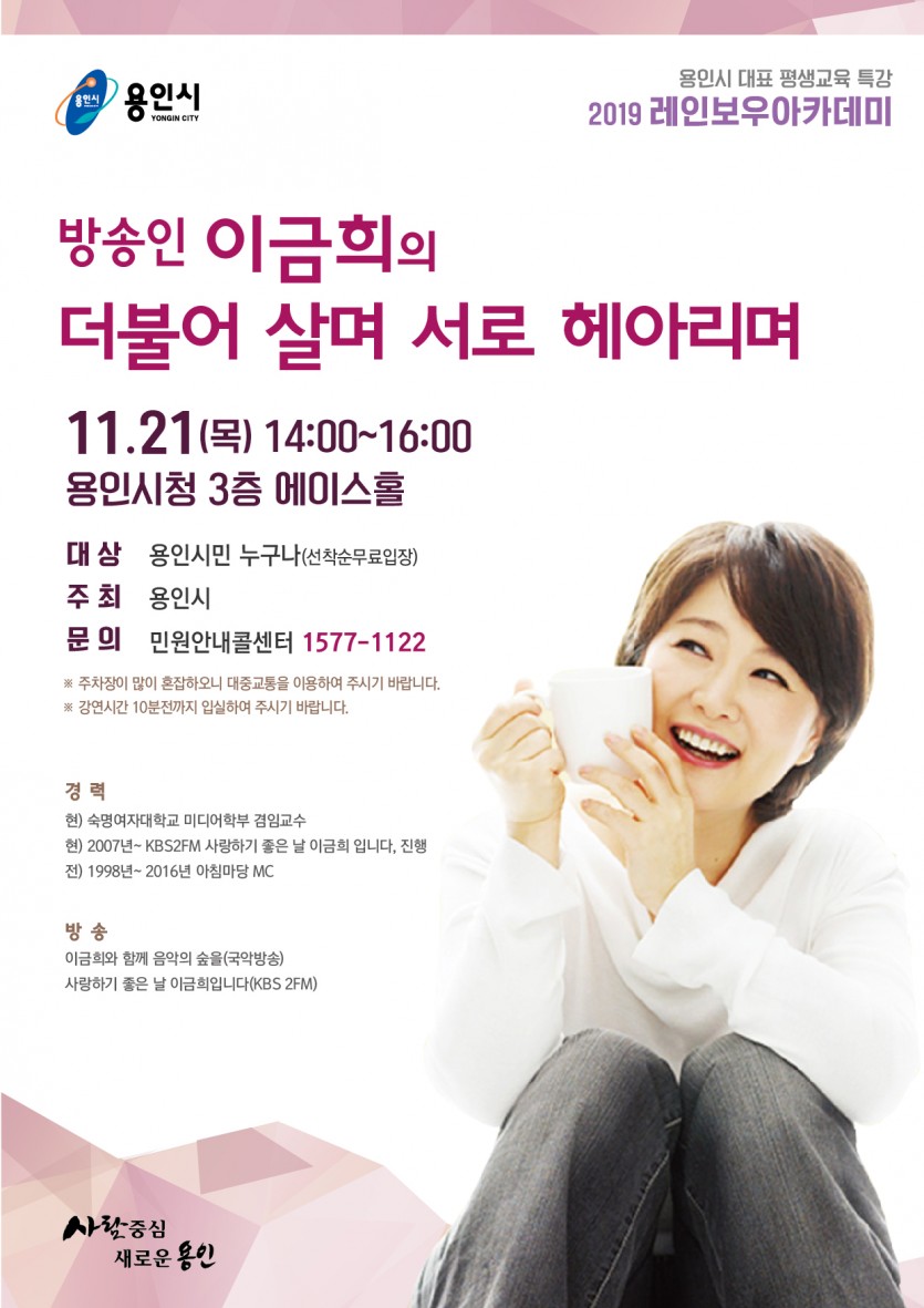방송인 이금희의 ‘가족과 더불어 사는 법’ 무료 특강 용인시, 21일 시청 에이스홀서 레인보우 아카데미 11월 행사 - 김경순 기자 2019-11-17 08:45 가 본문내용 확대/축소 본문 방송인 이금희의 ‘가족과 더불어 사는 법’ 무료 특강 용인시는 21일 시청 에이스홀에서 시민을 위한 무료강좌인 ‘레인보우 아카데미’의 11월 행사로 방송인 이금희씨의 특강을 연다. 이씨는 이날 ‘더불어 살며 서로 헤아리며’를 주제로 부모와 자녀, 남편과 아내 등 다양한 관계를 맺고 살아가는 가족의 행복한 이야기를 들려주고 서로 돕고 배려하는 방법을 알려줄 예정이다. 연세대학원을 졸업하고 KBS 16기 공채 아나운서로 입사한 이씨는 현재 KBS라디오 ‘사랑하기 좋은날 이금희입니다’를 진행하며 숙명여대 미디어학부 겸임교수로 활동하고 있다. 저서로 ‘나는 튀고 싶지 않다’를 펴낸 바 있다. 이 강연엔 용인시민 누구나 선착순 입장할 수 있다. 자세한 사항은 평생학습센터 홈페이지를 참조하거나 민원안내 콜센터(1577-1122)로 문의하면 된다. 좋아요 0 싫어요 0 김경순 기자 기자의 다른기사 보기 목록 댓글목록 이전글 용인도시공사, 아르피아 스포츠센터서 여성 1인기업 홍보 19.11.17 다음글 용인시민 열명 중 아홉 수돗물 수질‧요금에 ‘신뢰’ 19.11.17