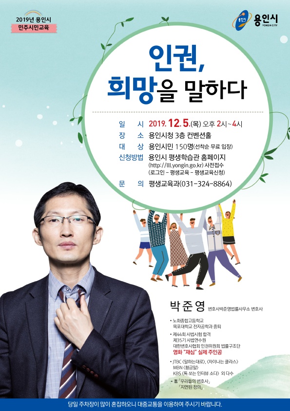 박준영 변호사의 ‘인권’ 강연 참여자 150명 모집 용인시, 12월5일 시청 컨벤션홀서…민주시민의식 교육 차원 - 김경순 기자 2019-11-21 18:55 가 본문내용 확대/축소 본문 박준영 변호사의 ‘인권’ 강연 참여자 150명 모집 용인시는 시민 스스로 인권을 지키고 민주시민의식을 갖추도록 여는 박준영 변호사의 ‘인권’ 강연 참여자 150명을 선착순 모집한다. 12월5일 시청 컨벤션홀에서 열리는 이 행사는 박 변호사의 ‘인권, 희망을 말하다’라는 주제 강연과 박영주 민주시민교육위원회 위원장 진행의 토크 콘서트로 구성됐다. 이날 박 변호사는 직접 사건을 해결하면서 겪은 사례를 통해 시민 스스로 인권의 중요성을 인식하고 생활 속 불합리한 상황에서 권리를 지킬 수 있도록 안내할 예정이다. 용인시민 누구나 무료로 참여할 수 있으며 신청은 시 평생학습관 홈페이지(http://lll.yongin.go.kr)를 통해 접수하면 된다. 영화 ‘재심’의 실제 주인공인 박 변호사는 대한변협 인권위원회 법률구조단으로 활동 중이며 다양한 방송 프로그램을 통해 재심전문 변호사로 잘 알려져 있다. 문의 : 용인시 평생교육과(031-324-8864) 좋아요 0 싫어요 0 김경순 기자 기자의 다른기사 보기 목록 댓글목록 이전글 구갈동, 청사 주변 가로수 30그루에 뜨게옷 입혀 19.11.21 다음글 청소년 4-H 회원 활동 결과 평가‘경진대회’열려 19.11.21