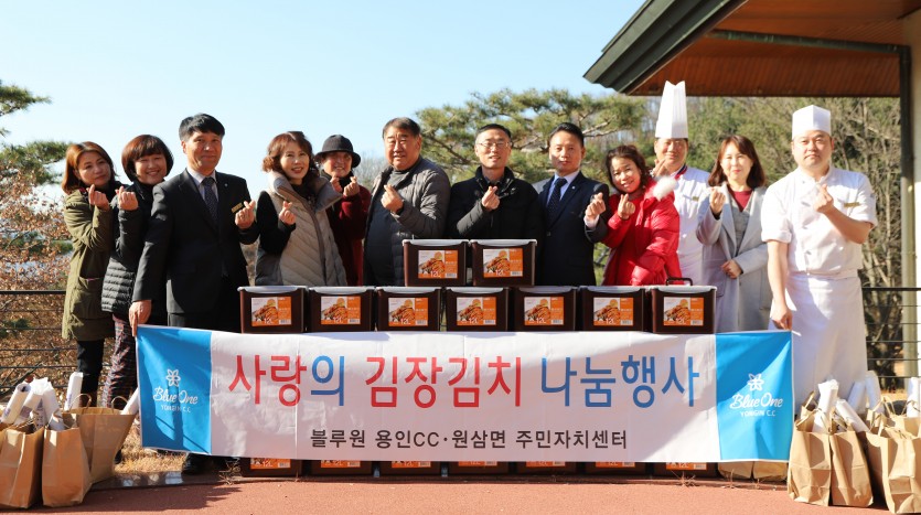블루원 용인C.C(대표이사 윤재연) 임직원들은 12월초 관내지역인 용인시 원삼면 주민자치센터 직원들과 함께 담근 김장김치 700포기를 원삼면지역 내 독거노인 30가구에 반찬과 함께 전달했다.