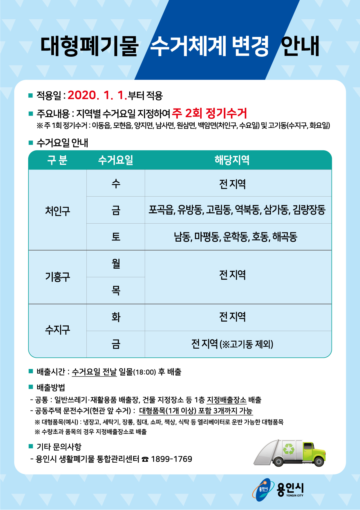 내년부터 대형폐기물 수거체계 전면 개편 용인시, 수거 효율 높이도록 지역별로 주2회 정해진 날에 배출 - - 시 홈페이지 개편해 생활 폐기물 관련 민원 원스톱으로 처리 - 김경순 기자 2019-12-18 09:59 가 본문내용 확대/축소 본문 내년부터 대형폐기물 수거체계 전면 개편 용인시는 17일 내년 1월1일부터 가전제품, 가구 등의 대형폐기물 정기 수거를 지역별 주1회에서 주2회로 늘린다고 밝혔다. 폐기물 수거 효율을 높이고 처리 지연이나 누락을 방지해 시민들의 불편을 해소하려는 것이다. 현재는 지역별로 월․수․금요일 주1회 수거하고 화․목․토요일에는 시 전역에서 예약 받은 폐기물을 수거했는데 효율적이지 않은 수거 동선으로 인해 처리가 늦다는 민원이 자주 발생했다. 내년부터 처인구 포곡읍․유방동․역북동․삼가동․김량장동․고림동은 월․수요일에, 마평동․남동․운학동․호동․해곡동은 수․토요일에 대형폐기물을 수거한다. 기흥구는 월․목요일, 수지구는 화․금요일에 대형폐기물을 수거한다. 처리량이 많지 않은 처인구 이동읍․모현읍․양지면․남사면․원삼면․백암면과 수지구 고기동은 주1회 수거하고 필요시 기동반을 투입키로 했다. 이와 관련해 시는 시민들이 소형가전이나 대형폐기물 배출 등 폐기물 관련 민원을 원스톱으로 처리 할 수 있도록 시 홈페이지에 안내하고 있다. 대형폐기물 품목별 분류 기준과 수수료를 쉽게 알 수 있도록 해당 품목의 실사도 기준표에 반영했다. 아울러 냉장고 등 대형가전이나 5개 이상의 소형가전을 무상으로 배출할 수 있도록 한국전자제품공제조합과 협약을 맺어 무상배출 예약 페이지를 홈페이지와 연동할 방침이다. 이를 위해 시는 남사면 대형폐기물 처리장 대신 내년부터는 고림동 공공집하장에서 처리할 수 있도록 시설을 개선하고 관련 조례 등을 개정했다. 시 관계자는 “매년 대형폐기물 물량이 증가하고 있는 추세”라며 “정기수거로 수집․운반 차량의 수거동선을 최적화해 불필요한 작업을 줄이고 시민들이 더욱 쾌적한 환경에서 지낼 수 있도록 할 것”이라고 말했다. 한편, 시는 다량의 폐기물을 문 앞에 내놓을 경우 안전상의 문제가 발생한다는 민원에 따라 대형폐기물 예약수거 시 내 놓을 수 있는 폐기물을 3개 이하로 제한키로 했다. 좋아요 0 싫어요 0 김경순 기자 기자의 다른기사 보기 목록 댓글목록 이전글 용인시, 일반택시 24대 증차 시 전체택시 1923대 19.12.18 다음글 <용인문화재단 2019 송년음악회> 19.12.18