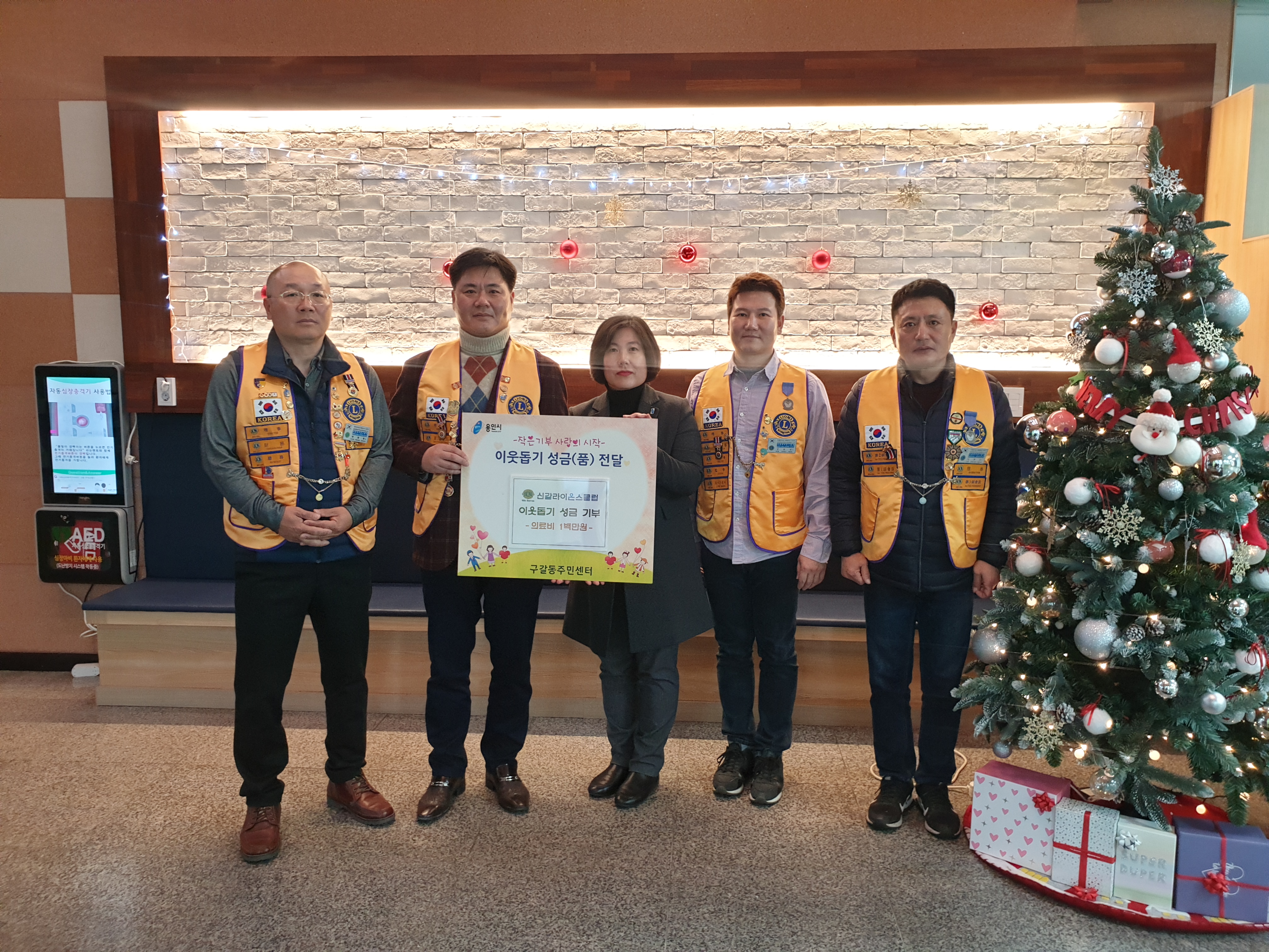 기흥구 구갈동에선 신갈라이온스클럽이 병마와 싸우며 의료비 부담으로 고통 받는 이들을 위해 써달라며 성금 100만원을 전달했다.