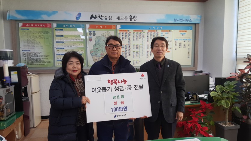 처인구 남사면 창리에서 맑은샘 가든을 운영하는 김용학‧구원숙 대표가 성금 100만원을 기탁했다. 이들 부부는 지난 2014년부터 지속적으로 결혼기념일에 맞춰 어려운 이웃을 위해 성금을 기탁해 왔다.