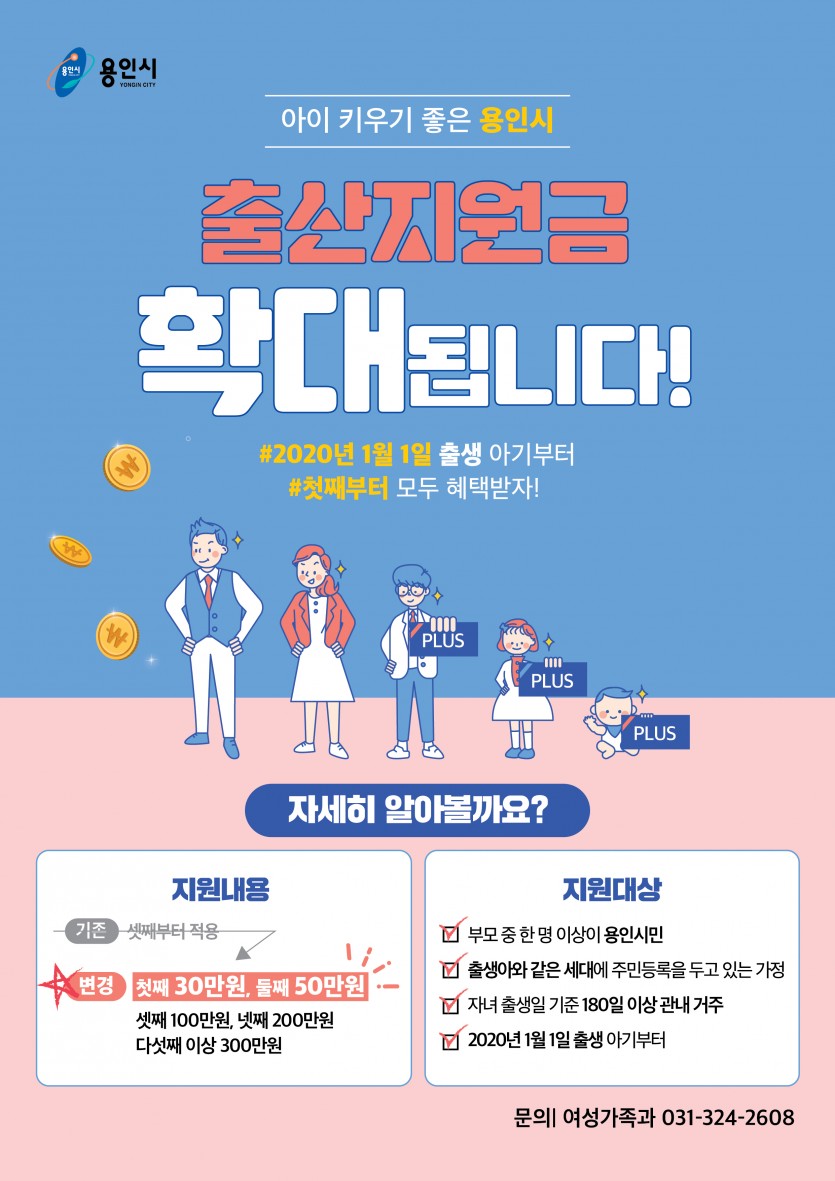 내년부터 첫째 ‧ 둘째 아이도 출산지원금 지급 용인시, 육아하기 좋은 환경 만들기 위해…첫째 30만‧둘째 50만원 김경순 기자 2019-12-30 20:15 가 본문내용 확대/축소 본문 내년부터 첫째 ‧ 둘째 아이도 출산지원금 지급 용인시는 내년 1월부터 출생 순위와 관계없이 모든 출생아에 대해 출산지원금을 확대 지급한다고 30일 밝혔다. 올해까진 셋째아부터 출산지원금을 지급했으나 시 출산가정의 91%가 자녀 1~2명만을 두고 있는 점을 감안해 모든 출산가정의 부담을 덜어주려는 것이다. 대상은 2020년 1월1일 이후 자녀를 출생한 가정이다. 용인시에 180일 이상 거주하고 부모 중 한명이 출생아와 같은 주소지에 주민등록을 둬야 한다. 신청을 하려면 거주지 읍면동 주민센터를 방문하거나 정부24 홈페이지 ‘행복출산 원스톱 서비스’를 통해 접수하면 된다. 지원금은 신청한 다음달 25일 신청인의 계좌로 일괄 지급되며 신청 기한은 출생일로부터 1년 이내다. 시 관계자는 “국가적 위기로까지 불릴만큼 심각한 저출산 문제를 해소하기 위해 출산을 시 차원에서 축하하고 육아하기 좋은 환경을 만들려는 것”이라고 말했다. 한편, 용인시 출산가구는 행복출산 원스톱 서비스로 출산지원금은 물론 아동‧양육수당, 산후조리비 등도 한 번에 신청할 수 있다. 좋아요 0 싫어요 0 김경순 기자 기자의 다른기사 보기 목록 댓글목록 이전글 농업인재 육성‘그린대학’14기 교육생 모집 19.12.30 다음글 용인경전철 예정됐던 파업 철회 정상운행 19.12.30