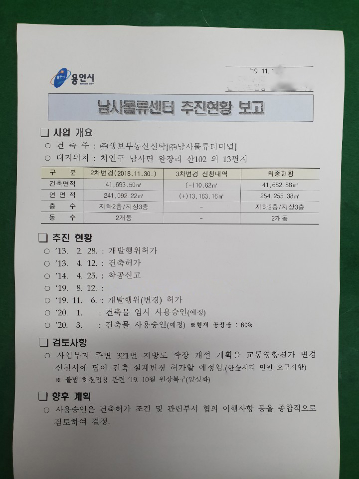 정 전 시장은 지난 26일 자신의 페이스북에 올린 <용인남사 한숲시티 입주민들께>라는 제목의 글에서 “일부에서 지산물류센터 허가를 내준 시장이 저 정찬민이라는 얘기를 하고 있다고 들었는데 이것은 전혀 사실과 다르다”며 “지산물류센터 허가는 제가 아닌 제 전임시장때 이뤄진 것”이라고 해명했다.