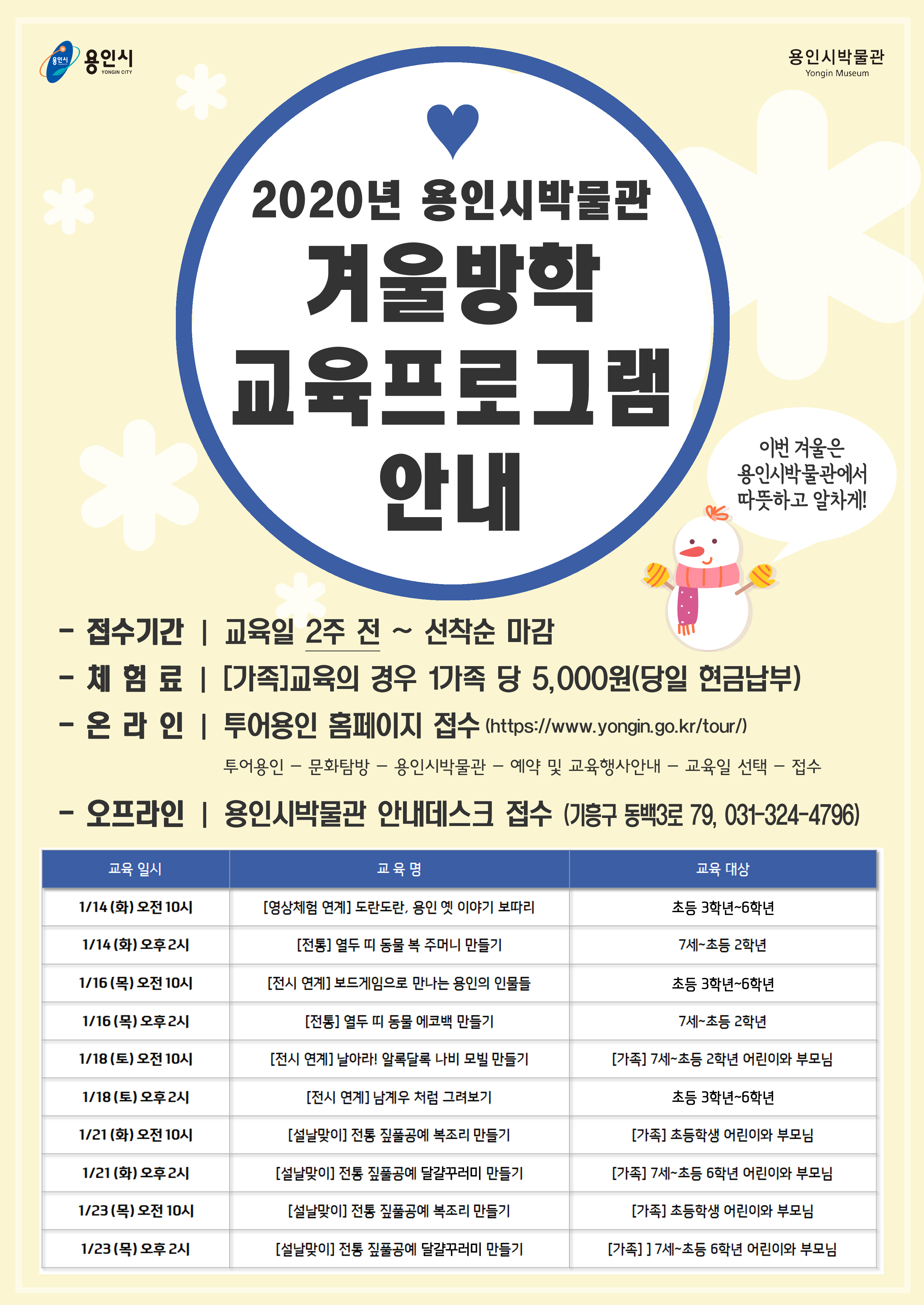 용인시박물관 겨울방학 체험 프로그램 참가자 모집 14일~2월15일 화‧목‧토…설날 유래‧풍습 체험, 역사적 인물 탐구 등 소비환경뉴스 2020-01-09 19:28 가 본문내용 확대/축소 본문 용인시박물관 겨울방학 체험 프로그램 참가자 모집용인시박물관 겨울방학 체험 프로그램 참가자 모집 용인시는 기흥구 중동 시 박물관서 역사적 인물 탐구, 전통공예 등 온 가족을 위한 체험 프로그램에 참가할 시민 660명을 모집한다. 겨울방학을 맞은 아이들과 함께 다양한 체험활동을 하며 유대감을 높이고 지역의 역사‧문화를 알아보는 기회를 주려는 것이다. 교육은 어린이와 어린이를 동반한 가족을 대상으로 14일부터 2월15일까지 매주 화‧목‧토요일 오전‧오후에 진행된다. 한 회당 20명까지 참여할 수 있다. 원하는 교육일 2주 전부터 투어용인 홈페이지(http://www.yongin.go.kr/tour)나 시 박물관 안내데스크에서 접수하면 된다. 참가자들은 보드게임으로 만나는 용인의 인물들, 열두띠 동물 에코백 만들기, 남계우처럼 그려보기 등 영상과 전시를 연계한 체험 활동을 하게 된다. 특히 설날의 유래와 풍습을 알아보고 전통 짚풀 공예 기법으로 온가족이 함께 달걀꾸러미와 복조리를 만드는 체험도 한다. 시 관계자는 “체험을 통해 아이들이 역사와 전통에 대한 올바른 정보를 익히도록 양질의 프로그램을 마련했으니 많은 시민들이 참여하기 바란다”고 말했다. 좋아요 0 싫어요 0 소비환경뉴스 기자의 다른기사 보기 목록 댓글목록 이전글 정찬민 전 용인시장 출판기념회에 지역주민 등 3천여명 참석해 대성황 20.01.10 다음글 구갈동, 지역사회보장협의체서 불우이웃 위한 음악회 열어 20.01.09