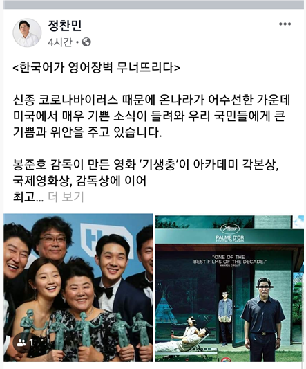 “한국어가 영어장벽 무너뜨렸다” - 정찬민 전 시장, 자신의 페북에 아카데미상 4관왕 차지한 봉준호 감독 극찬 - - “한국인의 자부심과 명예 드높여 국민들에게 큰 기쁨과 위안 안겨줘”- 김경순 기자 2020-02-10 22:51 가 본문내용 확대/축소 본문 “한국어가 영어장벽 무너뜨렸다” “한국어가 영어장벽 무너뜨렸다.” 자유한국당 용인갑 국회의원 예비후보인 정찬민 전 용인시장이 10일 봉준호 감독의 아카데미상 4관왕 수상에 대해 자신의 페이스북에 “한국인의 자부심과 명예를 드높였다”며 극찬의 축하 글을 올렸다. 정 전 시장은 ‘한국어가 영어장벽 무너뜨리다’라는 제목의 글에서 “봉 감독의 이번 수상은 아카데미 92년 역사상 영어가 아닌 외국어 영화가 처음으로 아카데미 작품상을 받았다는 사실”이라며 “이는 한국인 봉준호의 한국어 영화가 ‘영어장벽’을 무너뜨린 역사적 쾌거”라고 표현했다. 정 전 시장은 “최근 신종 코로나바이러스 때문에 온 나라가 어수선한데 미국에서 매우 기쁜 소식이 들려와 우리 국민들에게 큰 기쁨과 위안을 줬다”며 “국민의 한 사람으로서 봉준호 감독을 진심으로 축하한다”고 말했다. 그는 이어 “이는 한국 영화 101년 역사와 아카데미 92년 역사를 새로 쓴 것”이라며 “한국인의 자부심과 명예를 드높인 봉준호 감독과 출연배우 모든 분들에게 다시 한번 축하와 감사를 드린다”고 맺었다. 좋아요 0 싫어요 0 김경순 기자 기자의 다른기사 보기 목록 댓글목록 이전글 도, 지방도 375호선 은현~봉암 도로확포장 첫삽‥2022년 12월 완공 목표 20.02.11 다음글 백군기 시장“감염병 위기 중기‧소상공인 적극 지원” 20.02.10