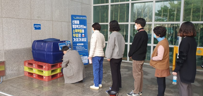구는 관내 행정복지센터에 400리터짜리 약품 탱크를 설치해 주민들이 용기를 가져오면 무료로 소독약을 받아갈 수 있도록 했다.