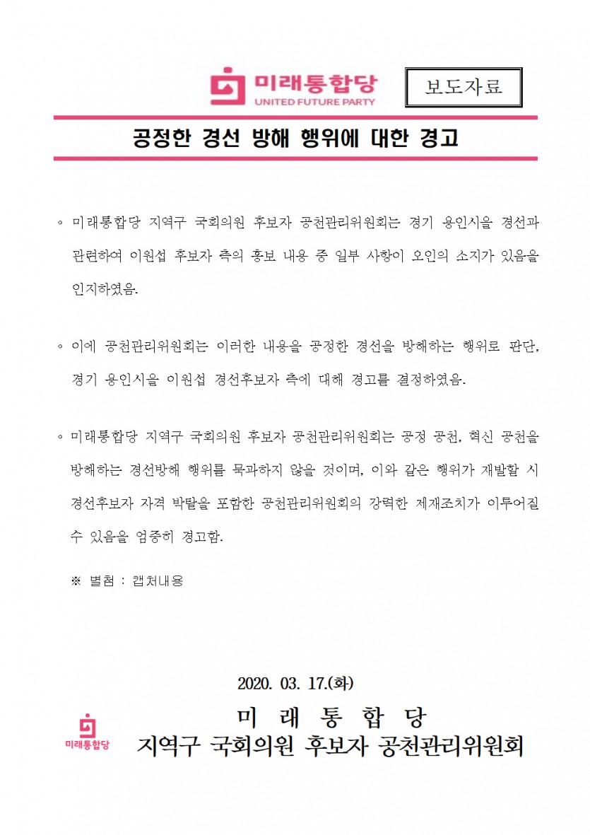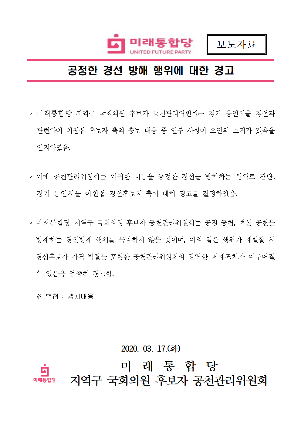 이원섭 예비후보 ‘공정한 경선 방해 행위에 대한 경고’ 조치 김경순 기자 2020-03-18 23:34 가 본문내용 확대/축소 본문 이원섭 예비후보 ‘공정한 경선 방해 행위에 대한 경고’ 조치이원섭 예비후보 ‘공정한 경선 방해 행위에 대한 경고’ 조치 -미래통합당 이원섭 예비후보 공정한 경선 방해 행위에 대한 경고- -이 후보자 측의 홍보 내용 중 일부 사항이 오인의 소지- 미래통합당 이원섭 용인시(을) 예비후보가 중앙당 공천관리위원회에서 ‘공정한 경선 방해 행위에 대한 경고’ 조치를 받았다. 미래통합당 지역구 국회의원 공천관리위원회는 용인시(을) 경선과 관련해 이 후보자 측의 홍보 내용 중 일부 사항이 오인의 소지가 있다고 18일 밝혔다. 이에 공심위는 이러한 내용을 공정한 경선 방해하는 행위로 판단, 용인시(을) 이원섭 경선후보자 측에 경고를 결정했다고 설명했다. 공심위 관계자는 “공정 공천, 혁신 공천을 방해하는 경선방식 행위를 묵과하지 않을 것”이라며 “이와 같은 행위가 재발할 시 경선 후보자 자격 박탈을 포함한 공천관리위원회의 강력한 제재조치라 이뤄질 수 있다”고 말했다. 좋아요 0 싫어요 0 김경순 기자 기자의 다른기사 보기 목록 댓글목록 이전글 분당제생병원서 용인시민 1명 확진환자 추가 20.03.18 다음글 용인시의회, 생활문화시설 지정 지역서점 의견 청취 20.03.18