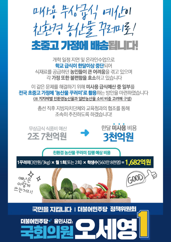 □ 오세영 더불어민주당 용인시갑 국회의원 후보가 11일 미사용 무상급식 예산으로 친환경 농산물 꾸러미를 초중고 가정에 배송하는 방안에 대하여, 지방자치단체와 교육청의 협조를 통하여 조속히 추진해야 한다고 밝혔다.