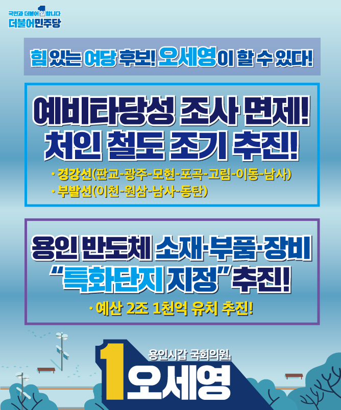 오세영 후보, 박광온 최고위원-이학영 의원과 합동 유세 김경순 기자 2020-04-13 05:45 가 본문내용 확대/축소 본문 오세영 후보, 박광온 최고위원-이학영 의원과 합동 유세 오세영 더불어민주당 용인시갑 국회의원 후보를 지원하기 위하여 12일 박광온 최고위원과 이학영 의원이 용인CGV 앞에서 함께 합동 유세를 진행했다. 오세영 후보는 “힘 있는 집권여당 후보로써 경강선과 부발선 예비타당성 조사 면제로 처인 철도 시대를 열고, 용인 반도체 소재·부품·장비 특화단지 지정으로 예산 2조 1천억 원을 유치하겠다.”는 야심찬 포부를 밝혔다. □ 오세영 후보는 “얼마 전 선대위 확대회의에도 참석해주신 박광온 최고위원님과 이학영 의원님께서 귀한 발걸음 해주셨다. 이는 집권여당인 더불어민주당의 용인발전 으뜸처인을 반드시 실현하겠다는 강력한 의지의 표현이라고 생각한다. 힘을 실어주기 위하여 방문해주신 중진 의원님들과 함께, 문재인 정부의 성공과 처인 지역 발전을 위하여 반드시 승리하겠다.”고 밝혔다. □ 이어 “중앙동에는 용인중앙시장 환경개선사업과 주차타워 건립을 통하여 소상공인 및 골목상권 활성화를 추진하고, 도시재생사업과 경안천 테마공원사업 확대하겠다는 약속을 드렸다. 또한 학교 인근 보행자도로 및 공공주차장 건립을 추진하는 등 생활 밀착 정책들도 세밀하게 추진하고, 용인공용버스터미널 현대화를 추진하겠다는 약속을 드린다.”고 밝혔다. □ 박광온 최고위원(수원시정, 재선)은 현 더불어민주당 최고위원이자 경기도당 위원장을 역임한 바 있다. 이학영 의원(군포시을, 재선)은 현 더불어민주당 예산결산위원장이자 노무현재단 상임고문을 역임중이다. 이번 21대 총선에서 오세영 후보를 응원하기 위하여 이석현 의원(안양 동안갑, 6선), 김진표 의원(수원시무, 4선), 이인영 원내대표(서울 구로갑, 3선), 전해철 의원(안산 상록갑, 재선), 임종성 의원(광주시을, 초선), 표창원 의원(용인시정, 초선)이 방문한 바 있다. 좋아요 0 싫어요 0 김경순 기자 기자의 다른기사 보기 목록 댓글목록 이전글 <우리동네 발코니 음악회> 성료 20.04.13 다음글 오세영 후보, 강한 여당의 힘으로 처인에 2조1천억 소·부·장 반도체 특화단지 조속히 유치하겠다. 20.04.13