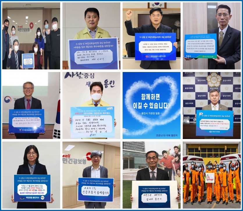 “함께 이겨내요”용인시 기관장들, 코로나19 극복 응원 메시지 이어져 김경순 기자 2020-04-22 05:02 가 본문내용 확대/축소 본문 “함께 이겨내요”용인시 기관장들, 코로나19 극복 응원 메시지 이어져 코로나19 사태가 장기화 국면에 접어들며 사회적 거리두기가 일상화되고 있는 가운데, 지난 6일부터 용인시 기관장들이 실시한 ‘코로나19 극복 챌린지’가 시민들에게 희망과 용기를 주고 있다. □ ‘코로나19 극복 챌린지’는 3·1운동 및 대한민국임시정부 수립 101주년을 맞이하여 그 의미와 정신을 계승하고 코로나19로 어려움을 겪고 있는 시민들에게 응원의 메시지를 보내기 위해 추진되었다. □ 이번 챌린지에는 백군기 용인시장, 이건한 용인시의회 의장, 박용주 경기동부보훈지청장, 이경호 용인소방서장, 이윤식 용인교육지원청 교육장, 이장희 한국도로공사 수원지사장, 이준호 국민건강보험공단 용인동부지사장, 곽지훈 국민건강보험공단 용인서부지사장, 최재학 용인축산농협 조합장, 채수현 국민연금공단 용인지사장, 김춘식 용인시인재육성재단 이사장 등 총 11명의 기관장들이 자발적으로 코로나19 극복을 위한 응원 캠페인에 동참했다. □ 챌린지에 참여한 용인시 기관장들은 “코로나19 사태가 하루 빨리 종식되어 시민 모두가 일상으로 돌아갈 수 있는 날이 오기를 염원하는 마음을 담았다”며 “현장에서 헌신하고 있는 의료진들과 계속되는 사회적 거리두기에 지쳐 있는 국민들에게 조금이나마 힘이 되었으면 한다“고 입을 모아 말했다. 좋아요 0 싫어요 0 김경순 기자 기자의 다른기사 보기 목록 댓글목록 이전글 코로나19로 상생하는 용인시민 20.04.22 다음글 용인서부경찰서, 죽전 로데오상점가 조합과 경제 활성화를 위한 업무협약(MOU) 체결 20.04.22
