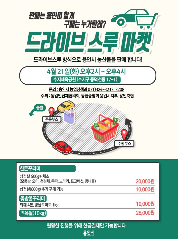 700여박스를 포장하여 200여박스는 동부경찰서 직원에게 500여박스는 드라이브스 스루마겟으로 수지체육공원에서 오후2시에서 4시까지 시민에게 21일 싱싱한 농산물이 시민에게 판매되었다.
