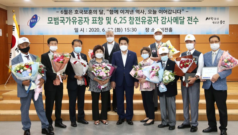 백군기 시장, 호국보훈의 달 맞아 9명 표창 격려 용인시, 6‧25 전쟁 참전 유공자 대표 2명에 감사 메달 수여 - 김경순 기자 2020-06-24 21:56 가 본문내용 확대/축소 본문 백군기 시장, 호국보훈의 달 맞아 9명 표창 격려 백군기 용인시장은 23일 호국보훈의 달을 맞아 나라를 위해 헌신한 국가유공자와 유족 9명에게 표창을 수여하고 격려했다. 백 시장은 “오늘의 대한민국을 있게 한 국가유공자들의 희생정신에 존경과 감사의 마음을 전하면서 보훈 가족에 대한 처우개선을 위해 최선을 다할 것”이라고 하였다. 이날 백 시장은 6.25전쟁 발발 70주년을 맞아 서귀섭 6.25참전유공자회 용인시지회 지회장 등 참전용사 대표 2명에게 은으로 만든 감사 메달을 전달했다. 국가보훈처가 제작한 이 메달은 관내 1698명의 6.25참전유공자 전원에게 전달될 예정이다. 한편, 시는 매년 6월 6.25전쟁 기념식을 열고 모범 국가유공자 표창을 수여해왔으나 올해는 코로나19 위기로 기념식 대신 이날 시상식만 축소 진행했다. 좋아요 0 싫어요 0 김경순 기자 기자의 다른기사 보기 목록 댓글목록 이전글 소아암 청소년 지원 및 혈액수급 위기극복 동참을 위한 용인시청소년미래재단 ‘임·직원 단체헌혈’ 20.06.24 다음글 박남숙, 전자영, 안희경, 이미진 의원, 매니페스토365캠페인 소통대상 부문 수상 20.06.22