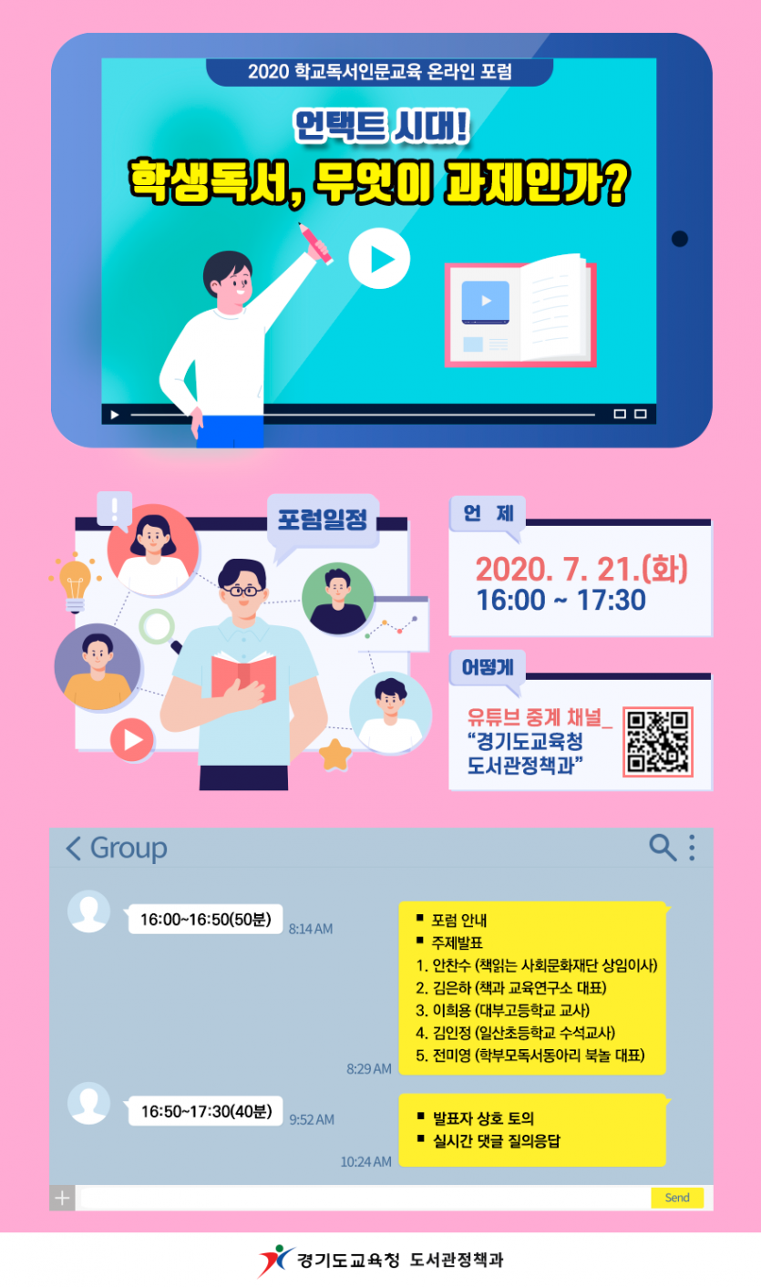 경기도교육청, 비대면 시대에 맞는 독서교육 활성화 프로그램 운영 여름방학 뒤 2학기 비대면 학습 대비, 온 · 오프라인 독서교육 강화 김양태 기자 2020-07-21 22:51 가 본문내용 확대/축소 본문 경기도교육청, 비대면 시대에 맞는 독서교육 활성화 프로그램 운영 경기도교육청(교육감 이재정)이 코로나 사태로 인한 비대면 시대에 맞는 다양한 온 ․ 오프라인 독서교육 프로그램을 운영한다고 21일 밝혔다. 독서교육 활성화 프로그램은 ▲학교 독서 인문교육 온라인 정책 포럼, ▲여름독서교실, ▲독서교육 콘텐츠 보급 등이다. 먼저 21일에는 유튜브 채널을 통해 학교 독서 인문교육 담당자, 교사, 학부모, 학생들이 실시간 쌍방향으로 참가하는 ‘2020 학교 독서 인문교육 온라인 정책 포럼’을 연다. 이번 포럼에서는 ‘비대면 시대! 학생 독서, 무엇이 과제인가?’를 큰 주제로 정하고, ▲온라인 교육 시대와 학생들의 사회적 독서, ▲너무 많아진 화면의 시간, 어떤 읽기가 필요할까?, ▲수업 시간에 책 읽기, 초등교실의 고민, ▲지금 상황에서 성장 독서 어떻게 할 것인가?, ▲집콕! 방콕! 시대 학부모는 무엇을 고민하고 있는가? 등의 작은 주제별 토의를 진행한다. 정책 포럼에 이어 7월 14일부터 8월 20일까지는 경기 교육도서관 9곳과 경기 평생교육학습관에서 ‘2020년 제101회 여름독서교실’을 운영한다. 쌍방향 온라인으로 마련한 도서관별 2020 여름독서교실은 ▲온라인 연결 시대에 정보 분별력을 키우는 디지털 리터러시(중앙), ▲슬기로운 온라인 진로탐구생활(평택), ▲독서를 통해 나의 흥미 찾아보기(광주), ▲도서관에서 나의 꿈 찾기(포천), ▲도서관에서 마음 면역력 기르기(김포), ▲온라인 문학의 숲(여주가남), ▲부모님과 함께하는 집으로 ‘온(ON)’ 여름독서교실(성남), ▲독서와 콘텐츠 창작활동(과천), ▲여름방학 독서여행(의정부), ▲책 함께 읽기와 독서 골든벨(평생) 등이다. 이 밖에 ‘경기 솔솔~독서 바람’을 분기별로 제작해 ▲교육과정 연계 온라인 독서교육, ▲학교도서관 공간 재구조화와 콘텐츠 활용, ▲교육도서관 온라인 독서교육 등의 다양한 사례를 발굴하고 학교 현장에 보급할 계획이다. 도교육청 지미숙 도서관정책과장은 “이번 온 ․ 오프라인 독서교육 프로그램으로 여름방학 뒤 학교 현장의 독서교육이 더욱 강화되길 기대한다”며, “앞으로도 도교육청은 비대면 시대에 맞는 독서교육 방향을 창의적으로 탐색해 가정과 학교에서 학생 주도 독서활동이 활성화되도록 지원하겠다”고 말했다. 한편 도교육청은 지난해 7월 국회도서관과 업무협약을 맺고 국회전자도서관의 도서, 학위논문, 간행물 등 문헌정보자원을 학교도서관에 지원하고 있다. 좋아요 0 싫어요 0 김양태 기자 기자의 다른기사 보기 목록 댓글목록 이전글 용인문화재단,“코로나19로 망한 기념일을 고쳐드립니다” 20.07.21 다음글 도내 이주민 상담활동가 역량강화 위한 ‘외국인 상담매뉴얼’ 발간 20.07.21