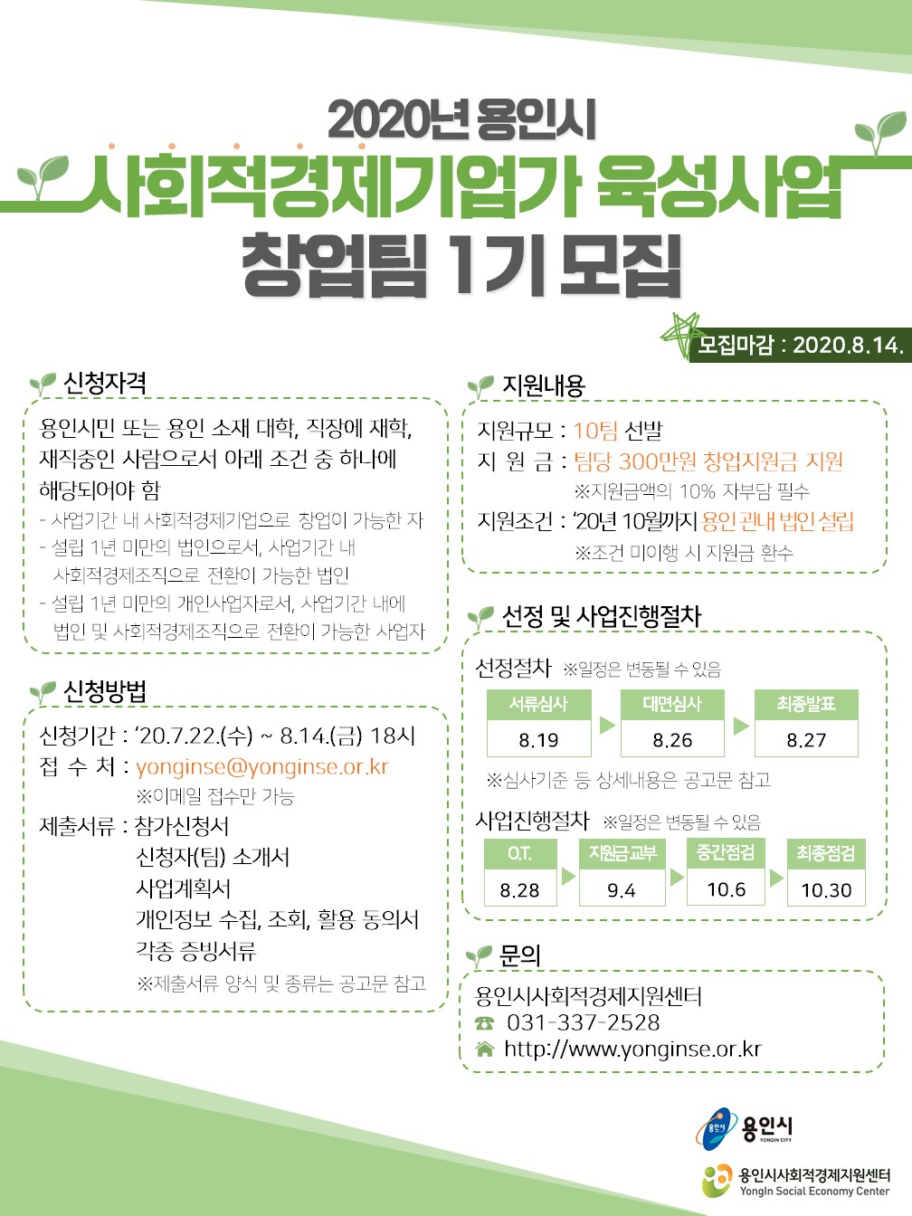 사회적경제 기업가 육성사업 창업팀 모집 용인시, 10팀 선발…창업자금 300만원 ‧ 컨설팅 등 지원 김경순 기자 2020-07-24 21:56 가 본문내용 확대/축소 본문 사회적경제 기업가 육성사업 창업팀 모집 용인시는 22일부터 8월14일까지 지역 사회문제 해결에 기여하는 사회적경제 기업가 육성사업에 참여할 창업팀을 모집한다. 사회적기업은 지역사회 공헌으로 주민의 삶의 질을 높이는 등 사회적 목적 실현을 위해 설립된 기업으로 주로 취약계층에게 일자리나 사회서비스를 제공하고 사회통합, 사회서비스 제공 등을 한다. 시는 10팀을 선발해 각 팀마다 300만원씩의 창업지원금과 실질적인 창업을 위한 컨설팅 ‧ 교육 등을 지원한다. 지원 대상은 사회적경제기업 관련 창업 계획이 있는 창업 준비팀이나 개인으로 용인시민 또는 용인 소재 대학 및 직장에 재학, 재직 중이면 된다. 신청을 원하는 단체나 개인은 용인시사회적경제지원센터 홈페이지(www.yonginse.or.kr)에서 신청서를 다운 받아 사업계획서 등 작성 후 이메일(yonginse@yonginse.or.kr)로 접수하면 된다. 자세한 사항은 용인시사회적경제지원센터(031-337-2528)로 문의하거나 홈페이지를 참고하면 된다. 좋아요 0 싫어요 0 김경순 기자 기자의 다른기사 보기 목록 댓글목록 이전글 인재육성재단서 저소득 아동에 휴대폰용품 6000개 기탁 20.07.24 다음글 용인시청소년수련관 청소년방과후아카데미 20.07.24