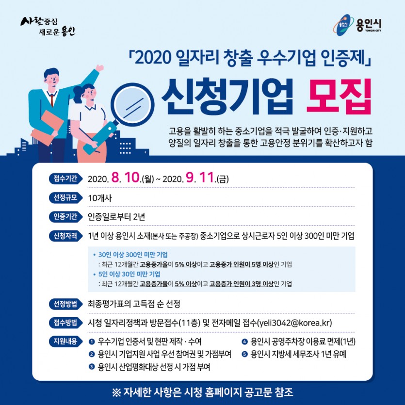 “일자리창출에 앞장선 중소기업 찾습니다” - 용인시, 10일부터 9월11일까지 신청 접수…10개사 선정 인증서 등 혜택 - 김경순 기자 2020-08-07 20:47 가 본문내용 확대/축소 본문 “일자리창출에 앞장선 중소기업 찾습니다” 용인시는 10일부터 9월11일까지 ‘2020년 일자리 창출 우수기업 인증’을 받을 관내 중소기업의 신청을 접수한다고 밝혔다. 시는 일자리가 많고 고용이 안정된 지역 분위기를 만들기 위해 지난 2018년부터 고용 우수기업을 선정해 다양한 인센티브를 제공해왔다. 신청 대상은 용인시에서 1년 이상 본사 또는 주공장을 가동하고 있는 중소기업으로 5인이상 300인미만의 상시근로자가 근무하고 있어야 한다. 또 2019년 7월31일부터 2020년 7월31일까지 고용증가율이 5% 이상이고, 신규 채용한 인원이 3~5명 이상이면 된다. 전년까진 고용증가율 10% 이상이어야 했지만 코로나19 여파로 기준을 완화했다. 우수 기업으로 선정되면 ▲인증서 및 인증패 수여 ▲각종 기업 지원사업 우대 ▲용인시 산업평화대상 선정 가점 ▲용인시 공영주차장 주차료 면제 ▲지방세 세무조사 1년간 유예 등의 혜택이 있다. 신청을 하려면 시 일자리정책과로 방문하거나 이메일(yeli3042@korea.kr)로 접수하면 된다. 서류 등 자세한 사항은 시 홈페이지에서 확인할 수 있다. 시는 참여한 기업 가운데 고용 증가율이나 정규직 채용률, 근로조건 우수성 등을 기준으로 서류심사와 현지조사를 해 최종 10개사를 선정할 방침이다. 시 관계자는 “코로나19 위기로 어려운 가운데 이번 제도로 고용 안정에 노력하고 있는 우수기업을 격려하기 위한 것”이라고 말했다. 한편, 시는 지난 2018년엔 ㈜윌링스 등 13개사를, 2019년엔 ㈜대우루컴스 등 6개사를 일자리창출 우수기업으로 선정했다. 좋아요 0 싫어요 0 김경순 기자 기자의 다른기사 보기 목록 댓글목록 이전글 경기도교육청, 다음 달 11일까지 학교공동체 인권 UCC·웹툰 공모 20.08.07 다음글 용인시의회 김기준 의장, 경기도시・군의회의장남부권협의회장 선출 20.07.31