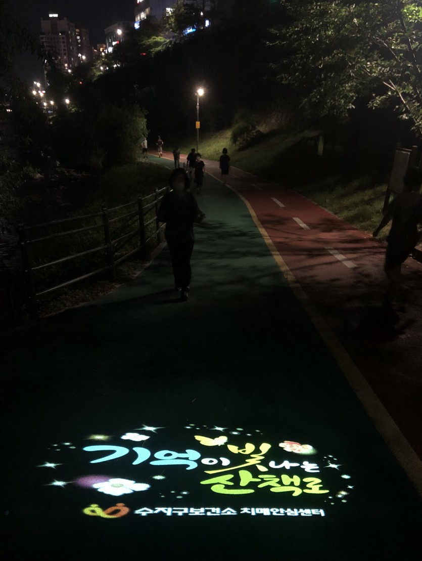 용인시 수지구보건소는 2일 올해 치매안심마을로 추가한 풍덕천2동의 성복·정평천 산책로 5곳에 치매에 대한 인식을 개선할 수 있도록 경관조명의 하나인 로고젝터를 설치했다고 밝혔다.