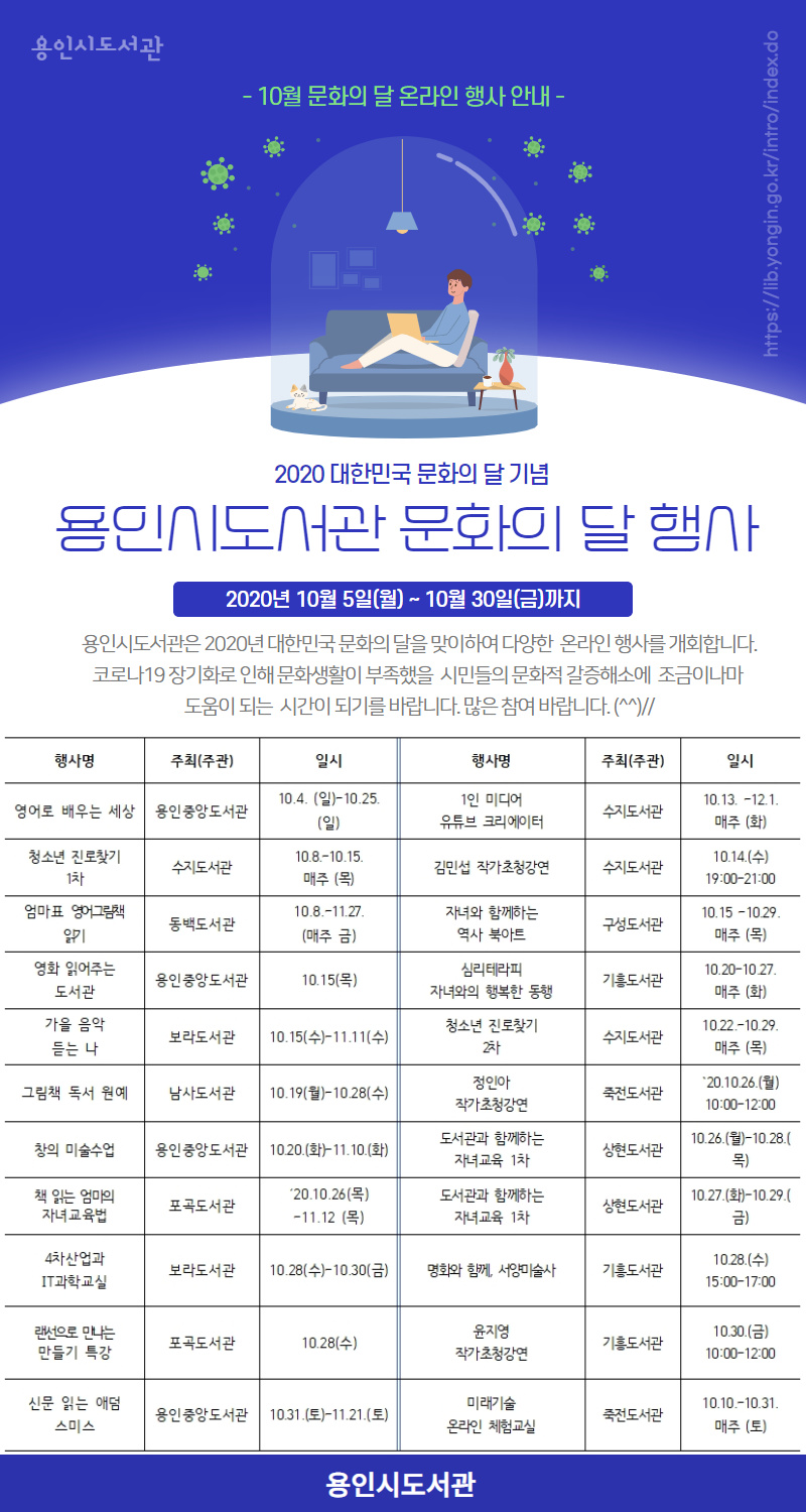 문화의 달 맞아 다채로운 온라인 프로그램 운영 - 용인시, 9개 공공도서관서 시민 문화갈증 해소 비대면 프로그램 개설 - 김경순 기자 2020-10-09 07:46 가 본문내용 확대/축소 본문 문화의 달 맞아 다채로운 온라인 프로그램 운영 용인시 도서관은 대한민국 문화의 달을 맞아 10월 한달 간 다양한 온라인 프로그램을 운영한다고 밝혔다. 코로나19 장기화로 인한 시민들의 문화적 갈증 해소에 도움을 주려는 것이다. 이를 위해 중앙・동백・포곡・보라・남사・수지・기흥・죽전・상현 등 9개 공공도서관은 역사책 만들기 체험, 청소년들을 위한 경제강의, 진로 코칭 등 다양한 연령층을 위한 프로그램을 개설했다. 특히 4차산업 메이커 융합교육, 1인 미디어 유튜브 채널 만들기, IT과학교실 등 4차산업 시대를 준비하는 교육도 마련됐다. 온라인 음악회 ‘가을 음악, 듣는 나’, ‘영화 읽어주는 도서관’, ‘그림책 원예 독서’ 등 코로나로 인한 우울 극복에 도움을 줄 프로그램도 준비했다. 행사 별 참가자 모집이나 자세한 일정은 용인시 도서관사업소 홈페이지를 참고하면 된다. 도서관 관계자는 “문화의 달 온라인 프로그램으로 다채로운 감성을 채우며 슬기롭게 코로나를 극복하는 시간이 되길 바란다”고 말했다. 좋아요 0 싫어요 0 김경순 기자 기자의 다른기사 보기 목록 댓글목록 이전글 용인시 20.10.11 다음글 처인구, 내년 주요현안 논의 시의원 간담회 개최 20.10.09