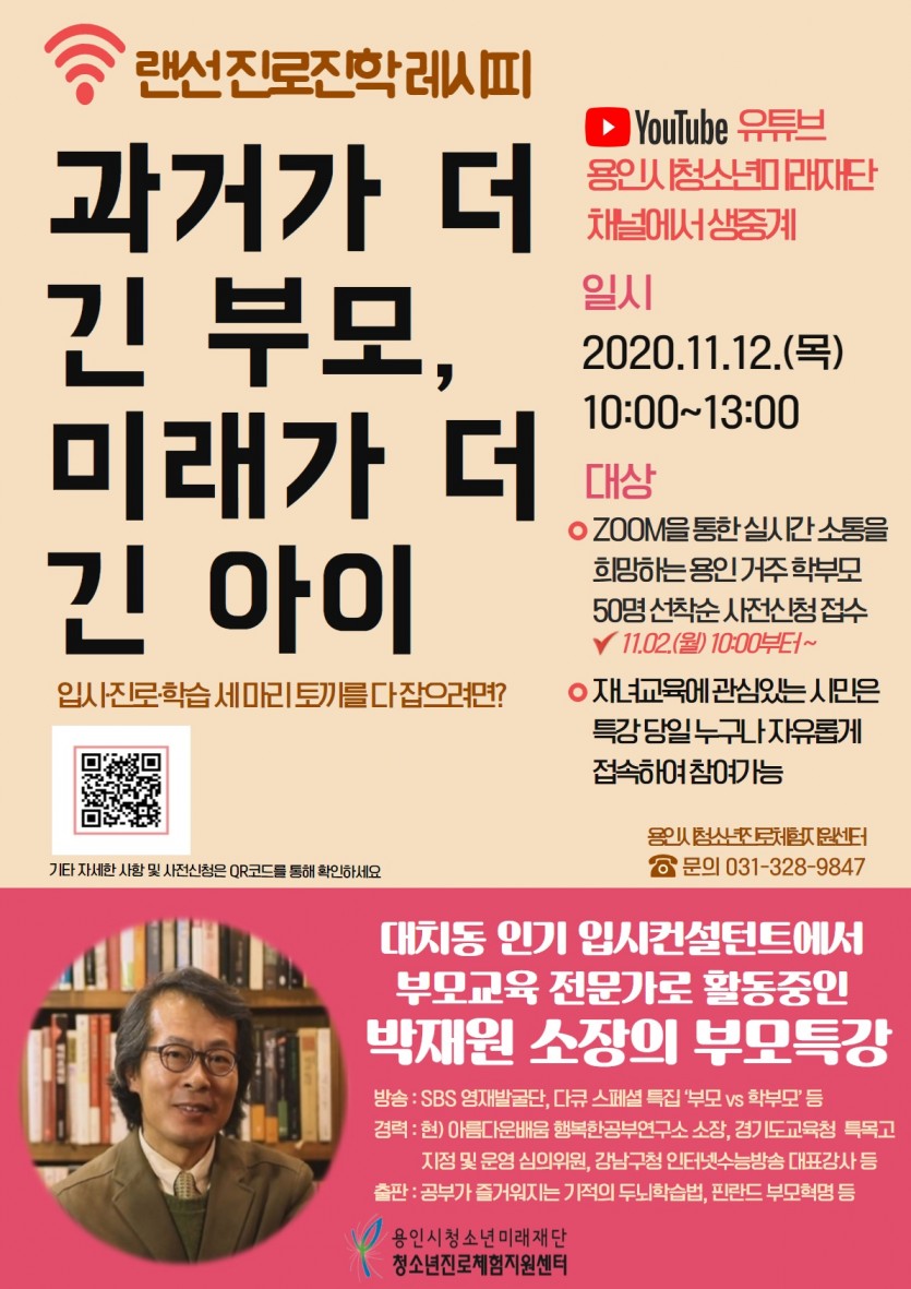 용인시청소년진로체험지원센터 2020년 제1회 진로진학 레시피 ‘박재원 소장 초청 랜선 부모교육 특강’진행 김경순 기자 2020-11-12 18:25 가 본문내용 확대/축소 본문 용인시청소년진로체험지원센터 2020년 제1회 진로진학 레시피 (재)용인시청소년미래재단(이사장 백군기) 용인시청소년진로체험지원센터는 아름다운배움 부설 행복한공부연구소 박재원 소장을 초청하여 ‘과거가 더 긴 부모, 미래가 더 긴 아이’를 주제로 부모교육 특강을 진행한다. 이번 부모교육 특강은 2020년 제1회 랜선 진로진학 레시피 프로그램으로 오는 11월 12일 목요일 10시에 유튜브 용인시청소년미래재단 채널에서 실시간 생중계 된다. 이번 부모교육 특강을 통해 입시·진로·학습 세 마리 토끼를 다 잡으려면 어떻게 해야하는 것인지, 과거를 살아온 부모가 미래를 살아갈 자녀에게 어떠한 역할을 해주는 것이 가장 현명한 것인지 알아보는 시간을 가질 예정이다. 강연을 맡은 박재원 소장은 서울시교육헝 자문위원으로 활동 중이며 EBS 라디오 ‘행복한 교육세상’ 진로진학 상담, 경기도교육청 특목고 지정 및 운영 심의위원, 강남구청 인터넷수능방송 대표강사 등을 역임했다. 또한 SBS 다큐 스페셜 특집 ‘부모 v s학부모’, ‘영재발굴단’ 등 다수의 방송에 출연하였고, 저서로는 ‘부모와 학부모 사이’, ‘대한민국 엄마 구하기’, ‘박재원의 부모효과’ 등이 있으며 과거 대치동 인기 입시컨설턴트에서 현재 부모교육 전문가로서 활발히 활동하고 있다. 이번 부모교육 특강은 특강 당일 ZOOM을 통해 박재원 소장과 실시간 쌍방향 소통을 희망하는 용인 관내 거주 학부모 50명을 온라인 사전신청을 통해 모집할 예정이이며 모집 일시는 11월 2일 월요일 오전 10시부터 선착순으로 모집한다. 참가혜택으로는 특강 당일 박재원 소장과의 쌍방향 소통을 통해 자녀교육에 대한 직접적인 궁금증을 해결할 수 있는 기회와 EBS 2021~2024년 대학입시정보집 및 소정의 기념품을 우편으로 받아 볼 수 있다. 이 외 프로그램에 관심있는 사람이라면 누구나 제한 없이 특강 당일 유튜브 용인시청소년미래재단 채널을 통해 자유롭게 참여할 수 있다. 참가신청과 관련한 자세한 사항으로는 http://naver.me/xUJVHktb를 참고하거나 포스터에 나와있는 QR코드를 통해 확인할 수 있으며 기타 문의사항은 용인시청소년진로체험지원센터 031-328-9847로 문의하면 된다. 좋아요 0 싫어요 0 김경순 기자 기자의 다른기사 보기 목록 댓글목록 이전글 포곡 영문중 ‧ 보정초 코로나19 진단검사 92명 전원 음성 20.11.12 다음글 용인시청소년진로체험지원센터 2020년 제2회 진로진학 레시피 20.11.12