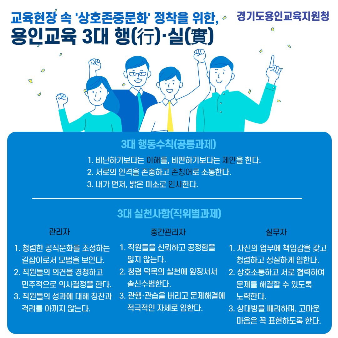 용인교육지원청, 교육현장 상호존중문화 정착을 위한 3대 행(行)·실(實) 선정 김경순 기자 2020-11-12 18:40 가 본문내용 확대/축소 본문 용인교육지원청, 교육현장 상호존중문화 정착을 위한 3대 행(行)·실(實) 선정 용인교육지원청은 교육현장 속 상호존중문화 정착을 위한 용인교육 3대 행동수칙과 3대 실천사항을 선정했다고 12일 밝혔다. 3대 행동수칙은 공통과제, 3대 실천사항은 직위별과제로 구성원 모두가 6개의 과제를 실천하여 갑질을 예방하고 존중과 배려가있는 학교문화를 조성할 수 있도록 하였다. 3대 행(行)·실(實)을 비롯한 용인교육지원청 반부패·청렴 활동은 공식 인스타그램 및 홈페이지에서 확인할 수 있다. 한편, 용인교육지원청은 올해 특색있는 다양한 반부패청렴활동을 추진해왔다. 청렴 새해다짐식을 시작으로 인스타그램 청렴퀴즈 이벤트, 청렴표어 공모전, 유투브 청렴교육 등을 통해 학생 및 교직원들과의 청렴소통에 힘써왔다. 또한 공무수행사인 관리시스템을 도입하여 용인교육지원청 각종 위원회 위원의 청렴성을 제고하고, 공무수행사인 현황을 공개하여 위원회 평가·심의의 투명성 확보를 위해 노력하였다. 용인교육지원청 이윤식 교육장은 “앞으로도 새롭고 다양한 청렴활동을 통해 청렴문화를 전파하며, 공정하고 책임있는 용인교육을 실현하기위해 노력하겠다.”라고 말했다. 좋아요 0 싫어요 0 김경순 기자 기자의 다른기사 보기 목록 댓글목록 이전글 용인지역 물환경 보호 및 개선을 위한 20.11.12 다음글 성복고‘학생․학부모․교사가 함께하는 인문학특강’개최 20.11.12