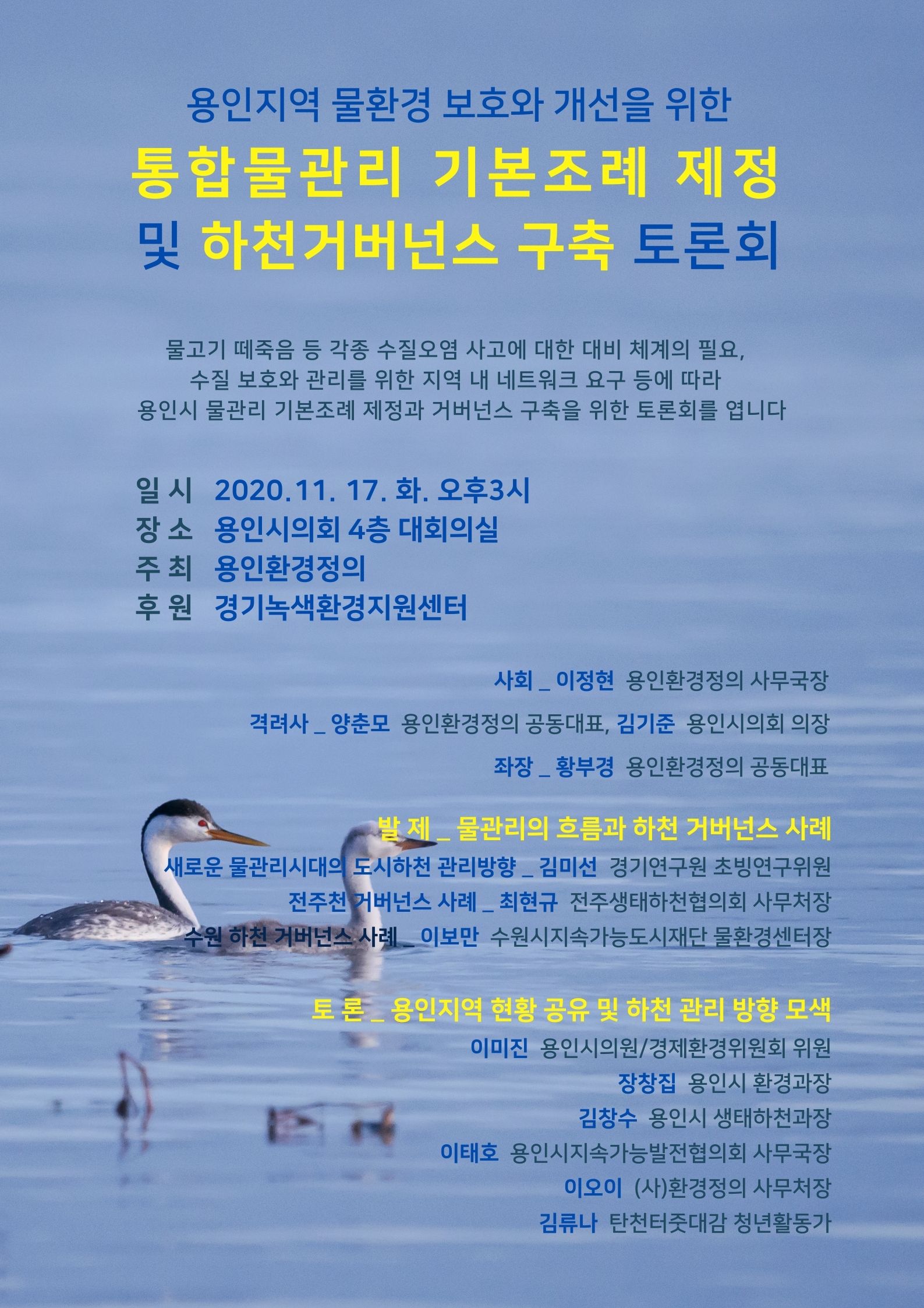 용인지역 물환경 보호 및 개선을 위한 통합물관리 기본조례 제정과 하천 거버넌스 구축 토론회 김경순 기자 2020-11-12 18:42 가 본문내용 확대/축소 본문 용인지역 물환경 보호 및 개선을 위한 물고기 떼죽음 등 각종 수질오염 사고에 대한 대비체계의 필요성 대두, 수질 보호와 관리를 위한 지역 내 네트워크 요구 등에 따라 용인시 통합물관리 기본조례 제정 및 하천 분야 거버넌스 구축을 위한 토론회를 아래와 같이 개최하니 취재 바랍니다. ---------------------------------- 아 래 ----------------------------------- ○ 일시 : 2020. 11. 17. 화. 오후3시~5시 30분 ○ 장소 : 용인시의회 4층 대회의실 ○ 내용 : 물관리의 흐름과 하천 거버넌스 사례 용인지역 현황 공유 및 하천 관리 방향 모색 ○ 주최 : 용인환경정의 [붙임] 1. 토론회 개요 2. 토론회 웹자보 [붙임] 1. 토론회 개요 ■ 개요 -. 제목 : 용인 통합물관리 기본조례 제정과 하천 거버넌스 구축을 위한 토론회 -. 일시 : 2020년 11월 17일 화. 15시~17시 30분 -. 장소 : 용인시의회 4층 대회의실 -. 목적 : 통합물관리 기본조례 제정과 하천거버넌스 구축 준비 및 과제 도출 -. 대상 : 용인시, 용인시의회, 전문가, 시민사회단체, 시민 등 -. 주최 : 용인환경정의 -. 후원 : 경기녹색환경지원센터 ■ 추진 배경 및 목적 (1) 배경 ◦ 최근 용인 관내 물고기 집단폐사 및 수질오염 사고 수차례 발생 ◦ 사고 시 대응체계가 미비한 상황에서 지역대비체계 필요성 대두 ◦ 수질 보호와 관리를 위한 지역 내 네트워크 구성 시급 (2) 목적 ◦ (단기) 수질오염 세부 대응 매뉴얼 점검 및 지역 네트워크 구축 ◦ (장기) 용인시 통합물관리 기본조례 제정 및 민관거버넌스 구축 ■ 토론회 프로그램 시 간 내 용 사회 이정현 용인환경정의 사무국장 15:00~15:10 개회 여는말 _ 양춘모 용인환경정의 공동대표 격려사 _ 김기준 용인시의회 의장 15:10~15:30 발제1 새로운 물관리시대의 도시하천 관리방향 _김미선 경기연구원 초빙연구위원 15:30~15:50 발제2 전주천 거버넌스 사례 _최현규 전주생태하천협의회 사무처장 15:50~16:10 발제3 수원 하천 거버넌스 사례 _이보만 수원시지속가능도시재단 물환경센터장 토론회 좌장 황부경 용인환경정의 공동대표 16:10~16:50 지정토론 이미진 용인시의원/경제환경위원회 위원 장창집 용인시 환경과장 김창수 용인시 생태하천과장 이태호 용인시지속가능발전협의회 사무국장 이오이 (사)환경정의 사무처장 김류나 탄천터줏대감 청년활동가 16:50~17:30 전체토론 용인 하천의 관리를 위한 과제 및 방안 등 토론 ■ 기대효과와 성과 활용방안 (1) 기대효과 ◦ 용인지역 내 수질오염 대응 매뉴얼 전문가 검토로 완성도 증가 ◦ 용인지역 내 물환경 관련 일반 시민의 관심 증대 ◦ 지역에서 활동하는 기관·단체의 네트워크 구성으로 물환경 문제 공동 대응 ◦ 민관학 협력으로 수질오염 발생 시 조속한 대처 가능 (2) 활용방안 ◦ 용인시 통합물관리 기본조례 제정 촉구 ◦ 조례에 기반을 둔 하천 거버넌스 구축 좋아요 0 싫어요 0 김경순 기자 기자의 다른기사 보기 목록 댓글목록 이전글 용인백현고, 학교를 허물고 마을로 확장되는 온라인 과학축제 열어 20.11.14 다음글 용인교육지원청, 교육현장 상호존중문화 정착을 위한 3대 행(行)·실(實) 선정 20.11.12
