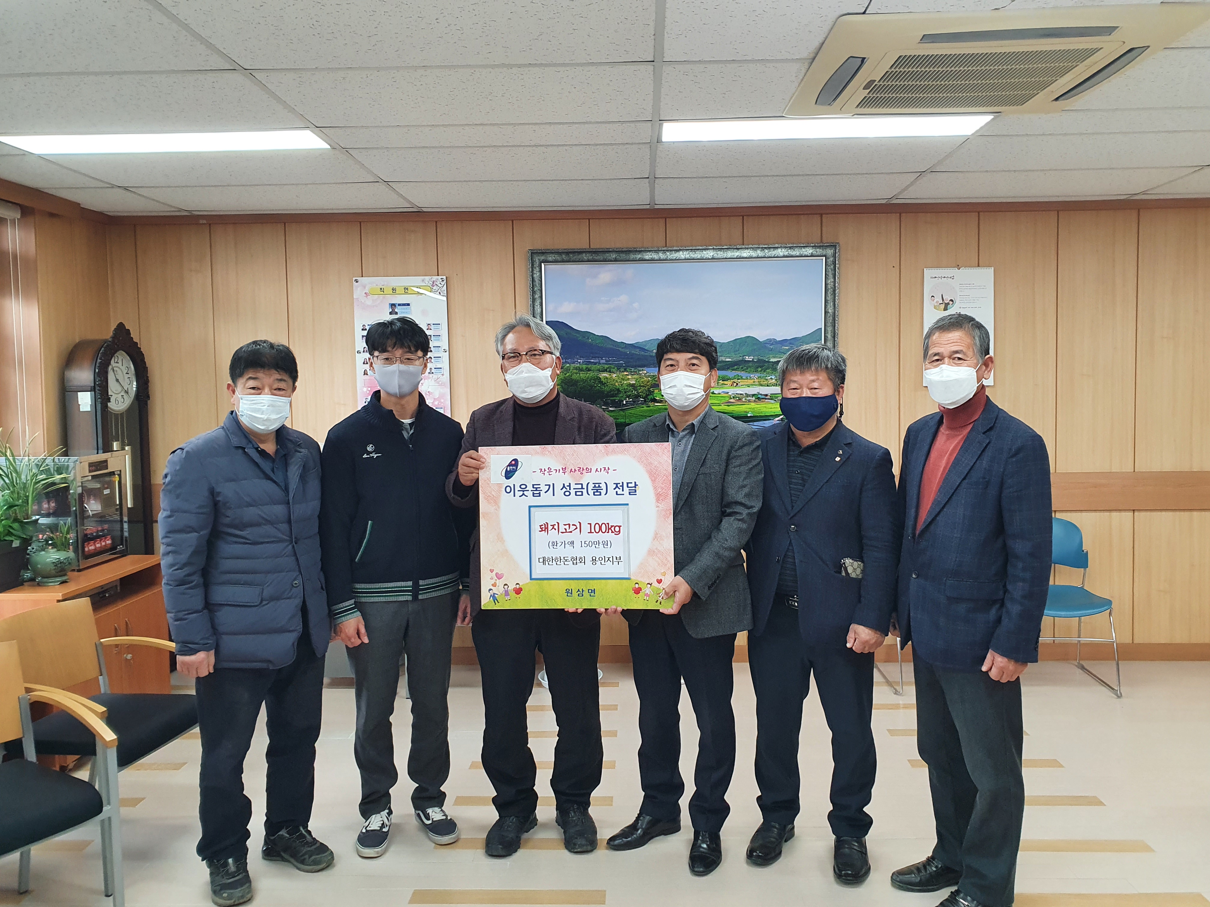 용인시 처인구 원삼면은 27일 대한한돈협회 용인지부가 어려운 이웃을 위해 써 달라며 돼지고기 100kg을 기탁했다고 밝혔다.
