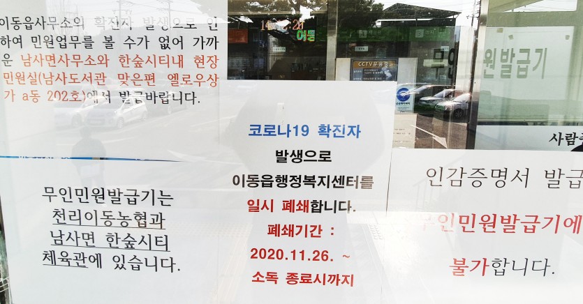 처인구 이동읍 행정복지센터 폐쇄・직원 등 45명 자가격리 조치 용인시, 일자리상담 근로자 1명 코로나19 확진…직원‧미화원 등 진단검사 실시 - 김경순 기자 2020-11-27 23:47 가 본문내용 확대/축소 본문 처인구 이동읍 행정복지센터 폐쇄・직원 등 45명 자가격리 조치처인구 이동읍 행정복지센터 폐쇄・직원 등 45명 자가격리 조치 용인시는 26일 처인구 이동읍 행정복지센터를 폐쇄하고 직원, 미화원 등 45명에 대해선 코로나19 진단검사를 받도록 하고 자가격리 조치했다고 밝혔다. 이는 동 행정복지센터에서 일자리상담사로 근무하는 근로자 1명(용인-526번, 기흥구 마북동)이 이날 민간검사기관인 GC녹십자의 코로나19 진단 검사결과 확진 판정을 받은 데 따른 것이다. 이에 시는 이동읍 행정복지센터와 주민자치센터를 폐쇄한 후 방역 소독하고 이동읍 민간단체에 확진자 발생 관련 안내 메세지를 전송했다. 또 추가적인 역학조사를 위해 읍 청사 출입자명부 등도 보건소에 제출했다. 이날 용인-526번으로 등록된 이 확진환자는 몸살 등의 증상이 있어 지난 25일 강남병원 선별진료소를 방문해 검체를 채취했다. 지난 19~20일과 25일에는 출근을 하지 않았으나 23~24일에는 근무를 한 것으로 확인됐다. 시는 용인-526번 확진환자의 국가지정격리병상을 요청하고 자택 내외부를 방역 소독한 뒤 동거인 2명의 검체를 채취했다. 시는 역학조사관의 자세한 조사 결과가 나오는 대로 접촉자를 추가 격리하고 동선을 방역 소독하는 한편, 공개범위 내 정보를 시민들에게 제공할 방침이다. 한편, 26일 오후 3시 기준 용인시 확진환자는 관내 등록 526명, 관외 53명 등 총 579명이 됐다. □신종 코로나 바이러스 감염증 관련 문의 질병관리본부 1339, 용인시콜센터 1577-1122 처인구보건소 감염병관리팀 ☎ 031-324-4981, 기흥구보건소 감염병관리팀 ☎ 031-324-6975, 수지구보건소 감염병관리팀 ☎ 031-324-8566 좋아요 0 싫어요 0 김경순 기자 기자의 다른기사 보기 목록 댓글목록 이전글 풍덕천2동, 관내 경로당서 사랑의 열차 이어달리기 성금 기탁 20.12.02 다음글 수지구, 아파트 내 공사 소음 내용과 시기 명시 동의서 양식 도입 20.11.27